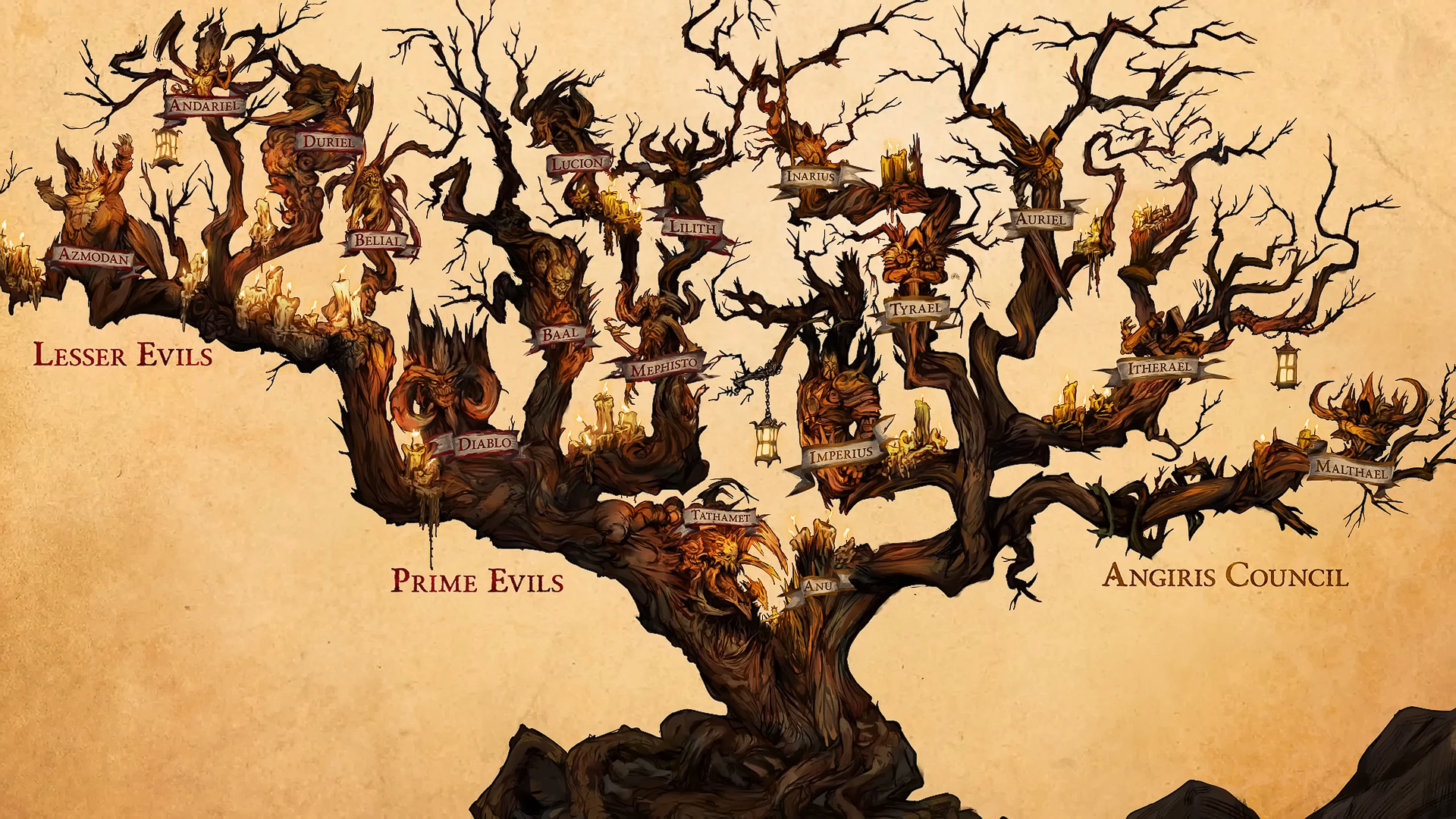En la tradición más repetida, tres de esos Males fueron los más poderosos: Diablo, Señor del Terror; Mefisto, Señor del Odio; y Baal, Señor de la Destrucción. Los otros cuatro, aunque llamados “menores” por comparación, no lo son para los mortales que padecieron sus pasos: Azmodán, Señor del Pecado; Belial, Señor de la Mentira; Andariel, Doncella de la Angustia; y Duriel, Señor del Dolor.