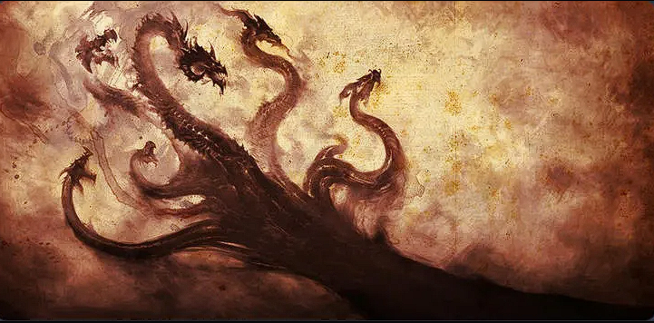 La imperfección expulsada no se disolvió. Se acumuló. Se compactó. Se deformó. Y, como si el universo necesitara darle rostro a lo rechazado, tomó forma en una bestia de siete cabezas: Tathamet. En ese instante, el mito deja claro que el mal —o aquello que después sería llamado mal— no llegó desde afuera. Nació como residuo de un intento de pureza absoluta.