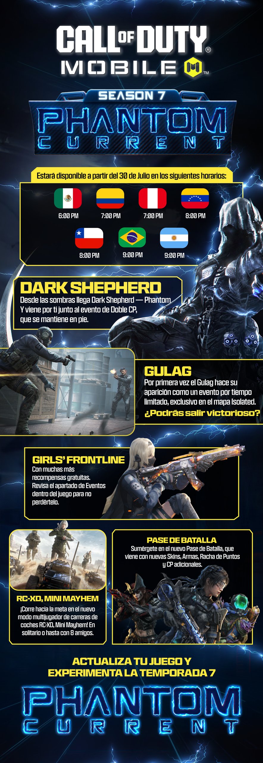 A partir del lanzamiento de hoy —cuya hora exacta varía según el país— los jugadores podrán sumergirse en esta nueva etapa que promete más desafíos y recompensas en el campo de batalla móvil. Activision ha puesto a disposición una infografía oficial con los horarios por país, útil para saber exactamente cuándo está activa la nueva temporada.