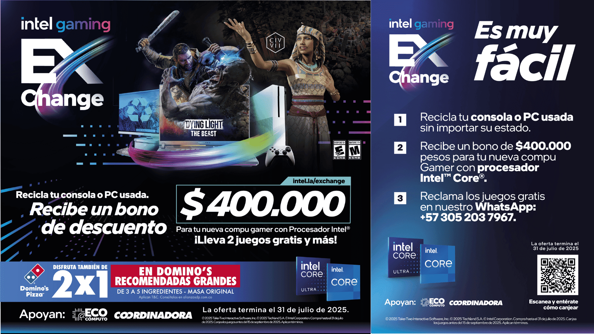 Quienes participen recibirán un bono de $400.000 COP para la compra de un computador gamer con procesador Intel® Core™ Serie H, de marcas como Acer, ASUS, HP, Lenovo o MSI. Además, recibirán dos videojuegos gratuitos: Sid Meier’s Civilization VII y Dying Light: The Best.