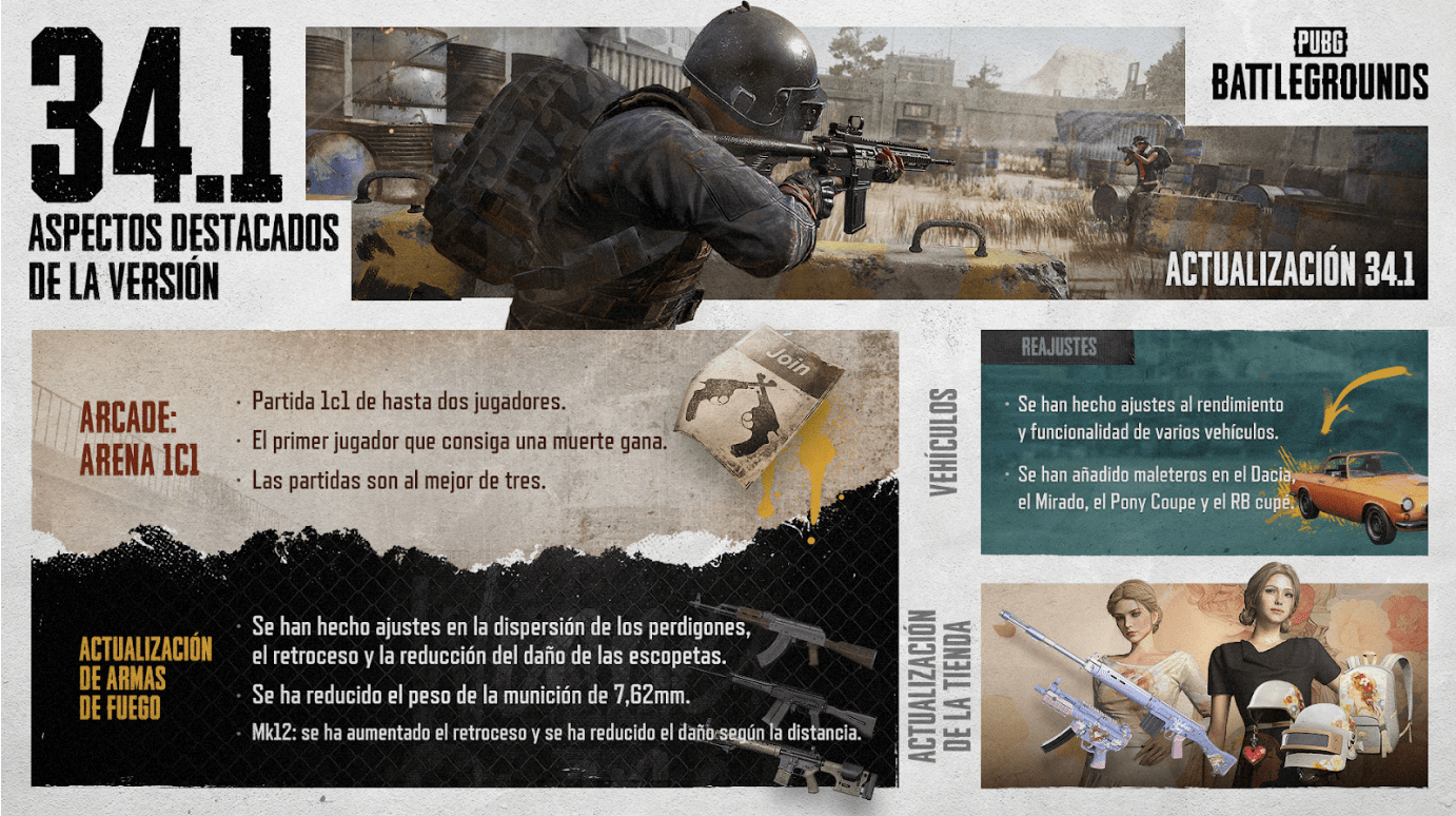 La actualización 34.1 de PUBG: BATTLEGROUNDS trae cambios en la Arena 1c1, reequilibrio de armas y mejoras en los vehículos