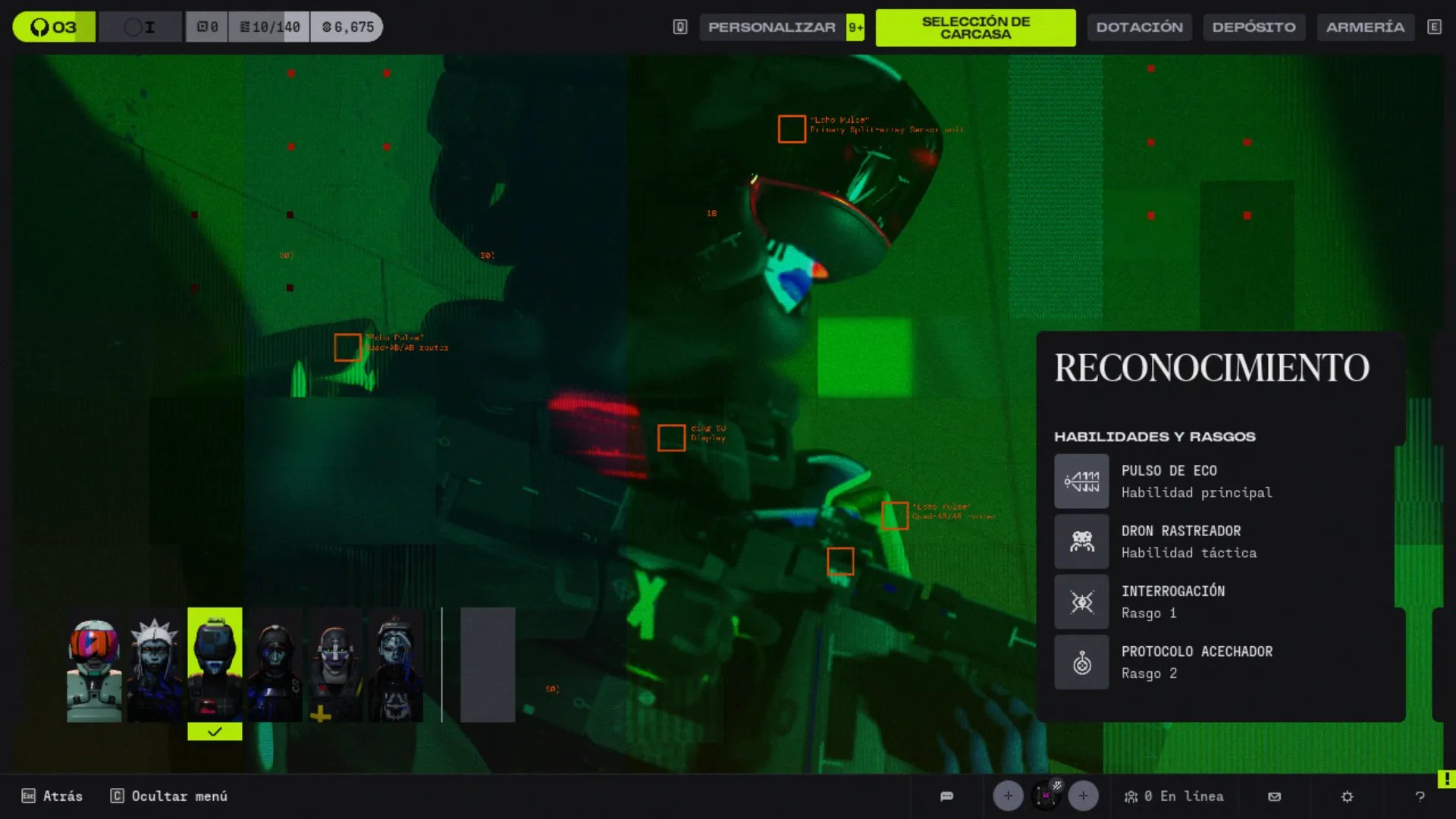 Recon es la Carcasa de inteligencia por excelencia, diseñada para revelar posiciones enemigas y facilitar kills para todo el equipo. Su kit permite rastreo constante y denial de movimiento, convirtiéndola en la elección ideal para tríos coordinados que quieren dominar la información.