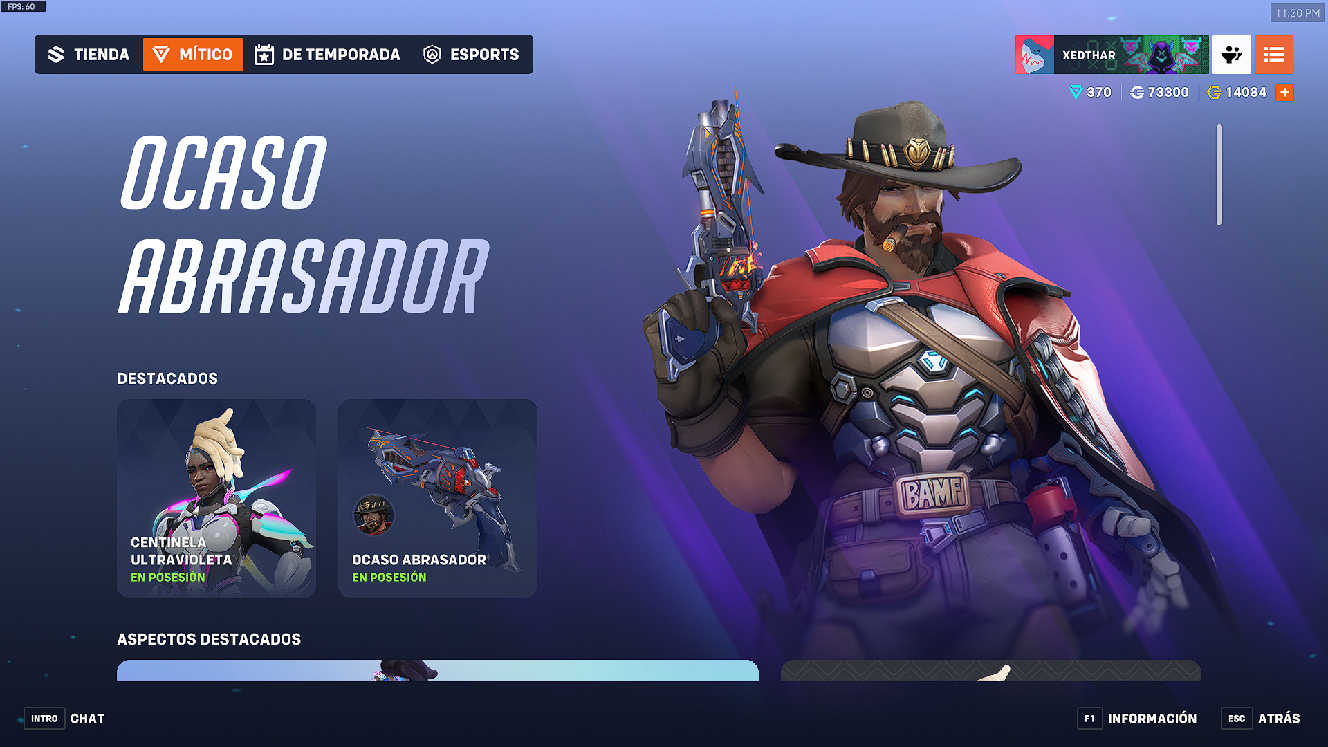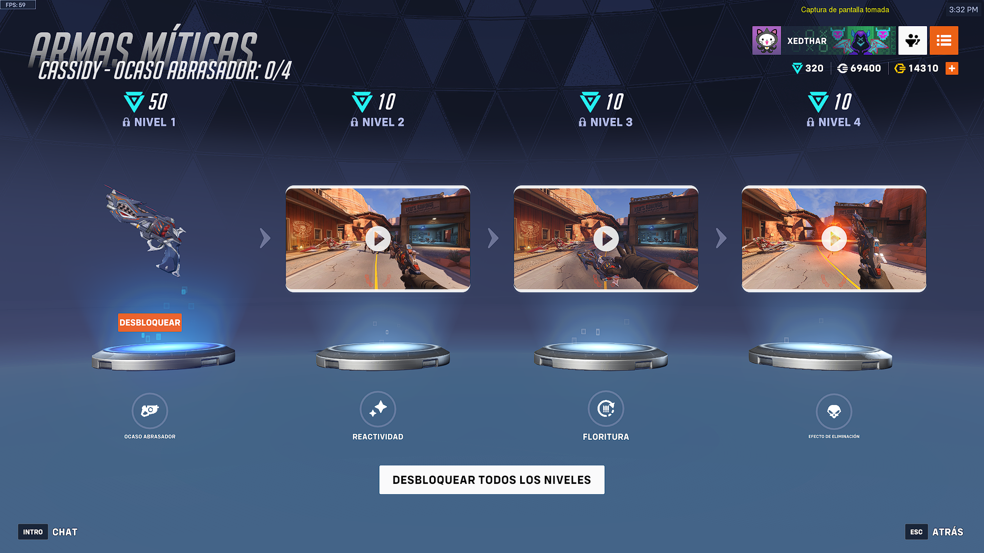 El arma mítica Ocaso Abrasador de Cassidy se encuentra disponible en la tienda mítica de Overwatch 2 y para desbloquearla se requieren 50 fragmentos míticos y por cada nivel adicional 10 fragmentos míticos, que pueden conseguirse en el pase de batalla o por compra directa.
