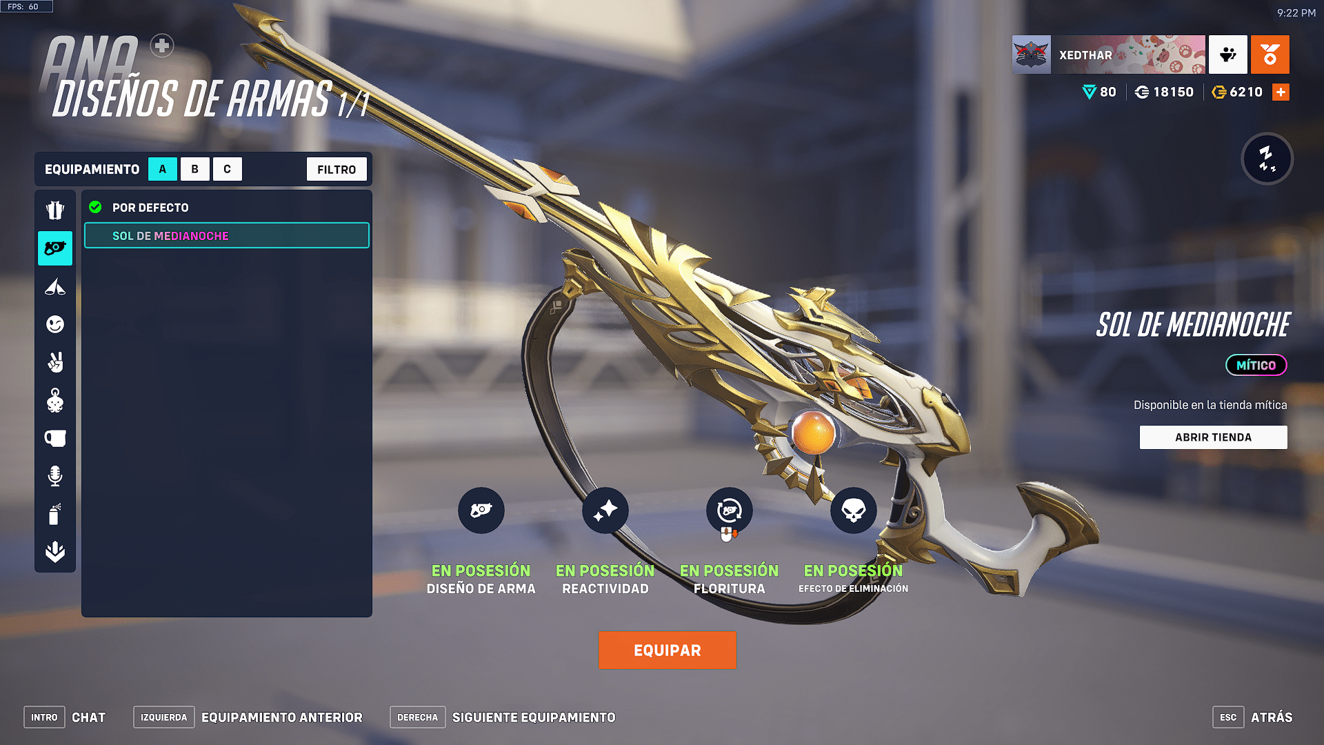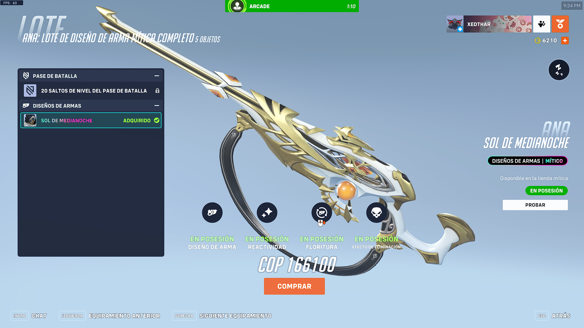 El Sol de Medianoche ya está disponible en la tienda mítica de Overwatch 2. Los jugadores deben recolectar 50 fragmentos míticos, una moneda especial que se puede adquirir tanto en el pase de batalla como en la tienda del juego. Estos fragmentos te permitirán desbloquear el diseño base de esta arma mítica, que luego podrá evolucionar en distintos niveles.