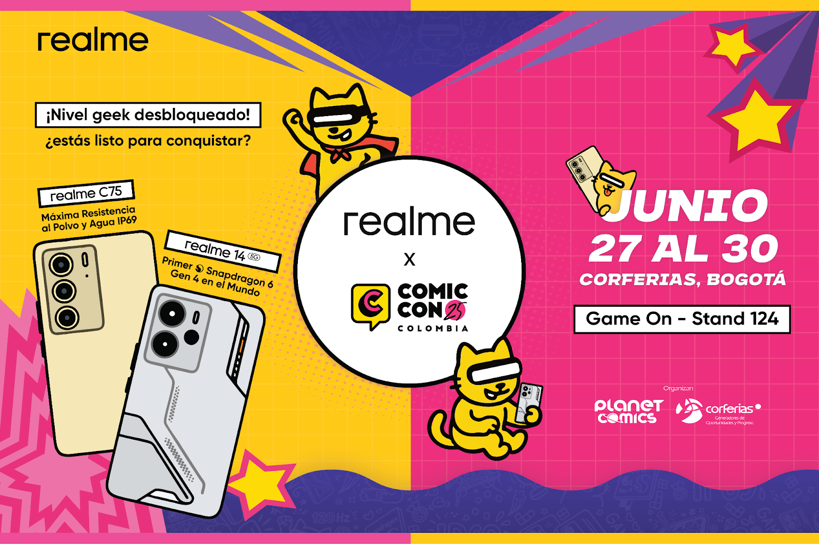 La Comic Con Bogotá 2025 será el escenario elegido por realme para presentar al público colombiano su más reciente dispositivo enfocado en gaming móvil: el realme 14 5G. Del 27 al 30 de junio, los asistentes al evento podrán visitar el Stand 124 en el Pabellón Game On y descubrir de primera mano el poder de este nuevo smartphone pensado para jugadores exigentes.