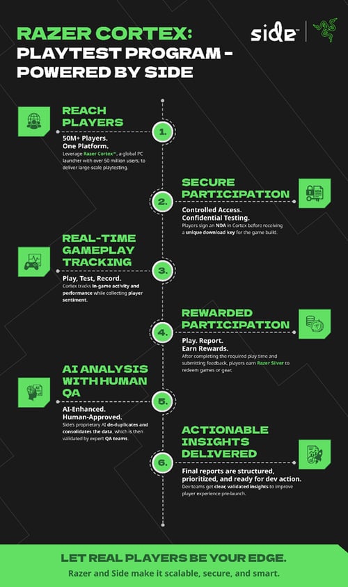 El Razer Cortex Playtest Powered by Side combina pruebas de jugabilidad tradicionales con QA a gran escala, utilizando la tecnología de IA propia de Side para analizar datos de juego y eliminar duplicidades. Los desarrolladores pueden realizar pruebas con más de 100,000 jugadores reales, preseleccionados según sus perfiles, intereses y hábitos a través de Razer Cortex. Los participantes firman acuerdos de confidencialidad (NDAs), reciben claves exclusivas para builds y proporcionan feedback mediante encuestas cualitativas. El sistema rastrea tiempo de juego y rendimiento, generando insights accionables validados por expertos en QA de Side, todo a un costo significativamente menor que los métodos tradicionales.