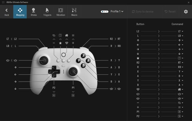 El software Ultimate de 8BitDo es lo que hace que sus controladores sean tan especiales. Con él, puedes cambiar prácticamente cada parte de la funcionalidad del controlador. Puedes elegir uno de los tres perfiles, luego reasignar botones, cambiar la sensibilidad de tus joysticks y gatillos, modificar la vibración, y crear macros que pueden ser activadas con una sola pulsación de botón. Lo mejor de todo es que puedes hacer todo esto desde tu PC, Mac, iPhone o dispositivo Android. El controlador es capaz de almacenar tres perfiles para Windows y tres para Switch.