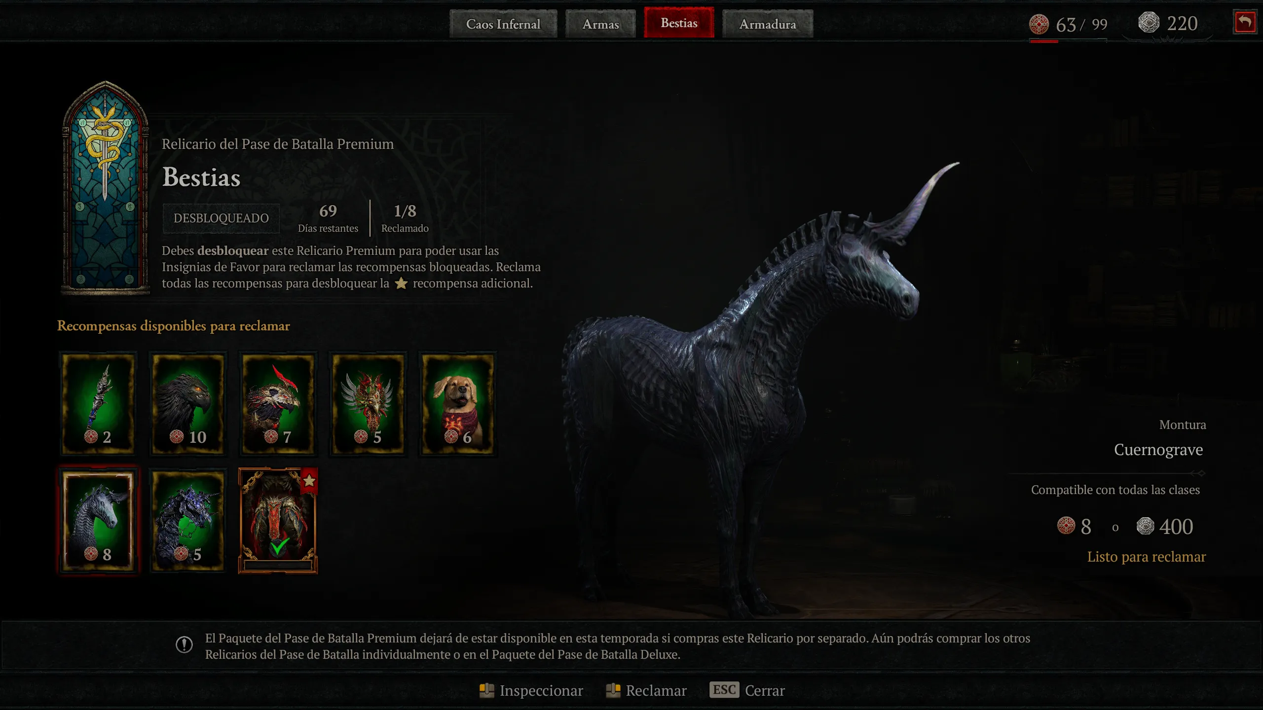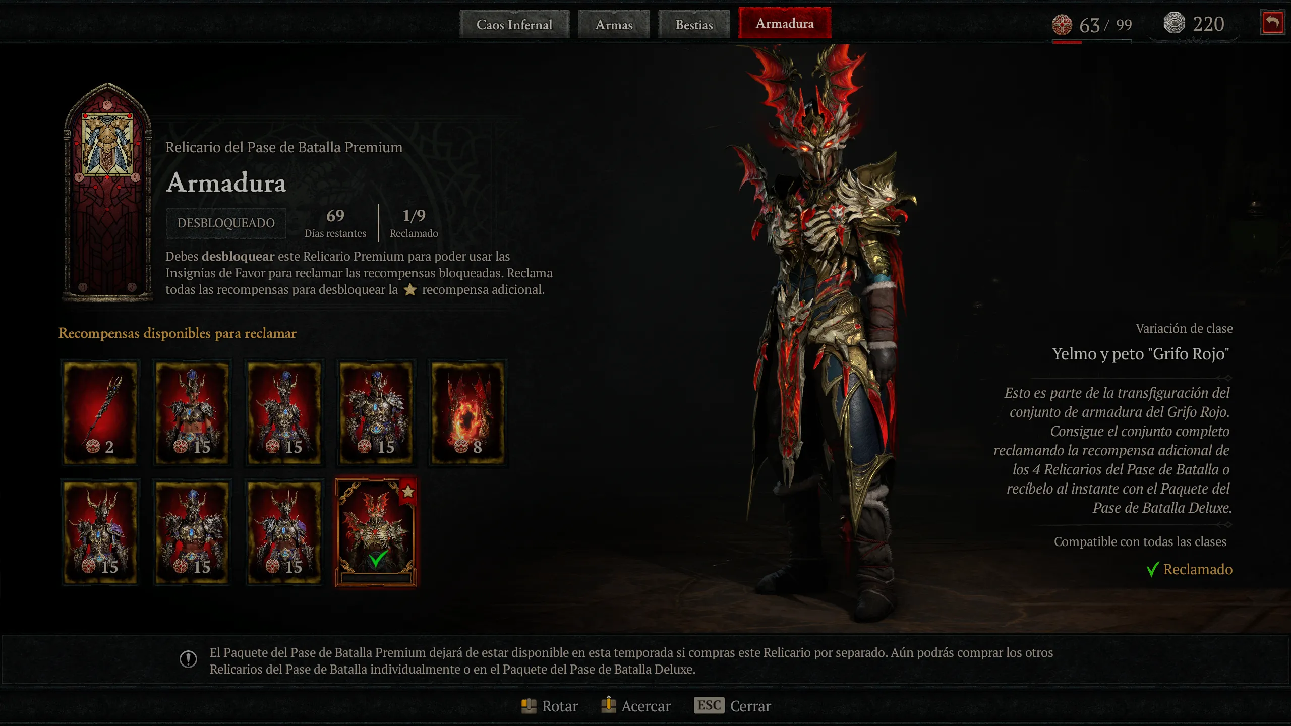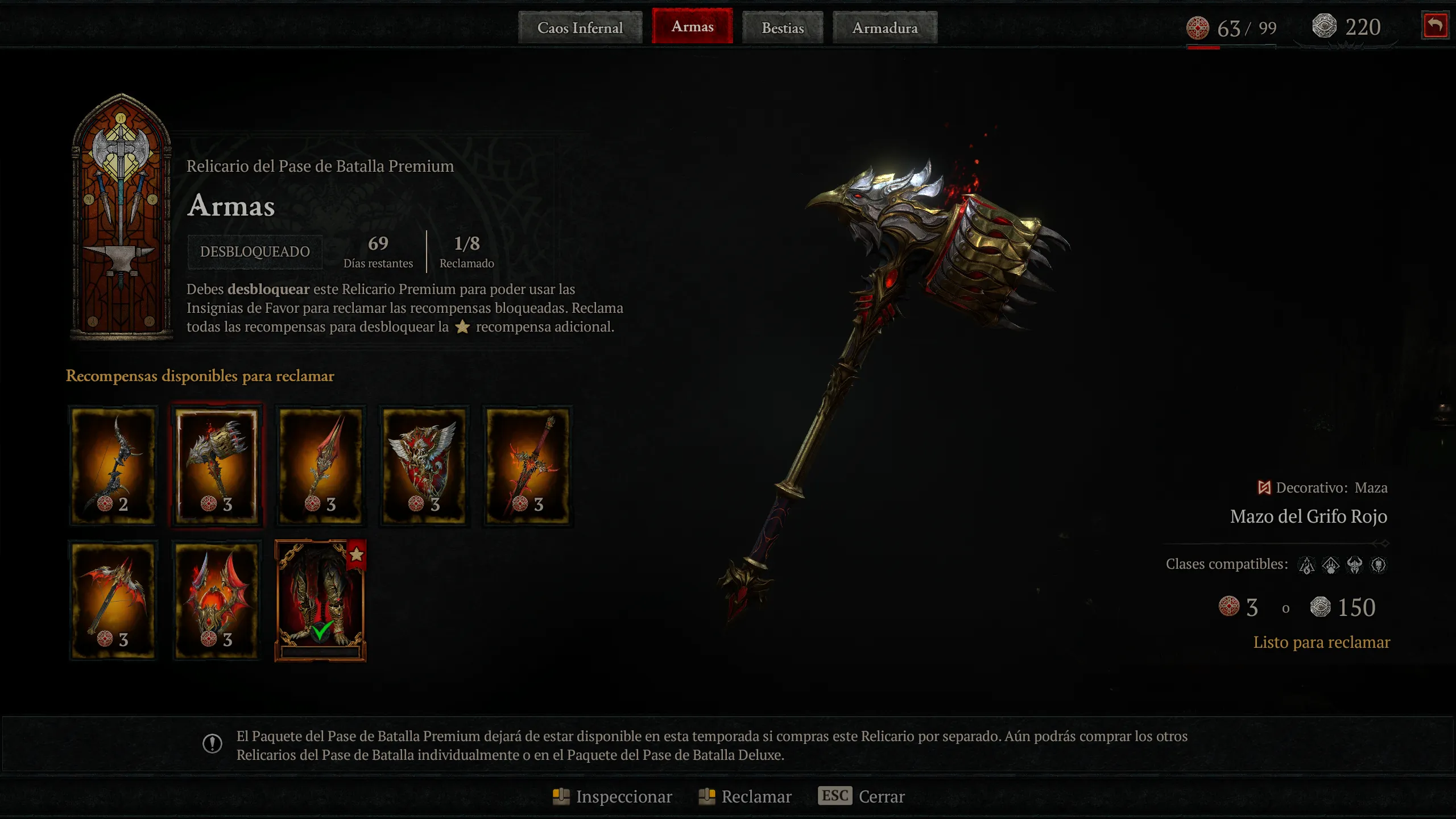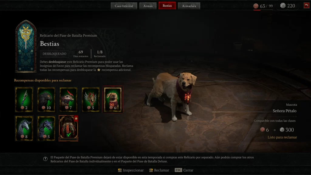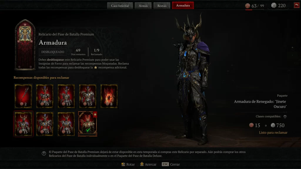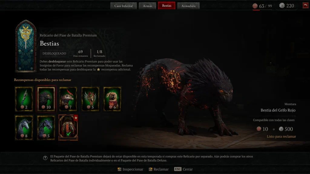 La progresión estacional gira en torno al Battle Pass con tiers de recompensas cosméticas y materiales, desbloqueando objetos de caos para potenciar builds en end-game. La integración con Vessel of Hatred añade sinergias, aunque la campaña de temporada se agota en 10-15 horas, dejando un grind repetitivo sin incentivos narrativos profundos. El Battle Pass se estructura en Reliquaries temáticas (Infernal Chaos gratuita, Weapons, Beasts y Armor premium), progresadas con Favor tokens ganados jugando. La Reliquary gratuita incluye Feathermane Mount, Barding, Dark Horseman’s Door Town, weapon skins, gear cosmetics y Platinum. Las premium cuestan 200 (Weapons), 500 (Beasts) y 800 (Armor) Platinum, con un bundle de 1.000 Platinum para las tres. El Deluxe Bundle desbloquea las premium inmediatamente, más la Red Griffin armor set por clase, Wings of the Red Griffin Back Trophy y Angiris the Brave Pet. El sistema recompensa hasta 700 Platinum por Reliquary completada, insuficiente para el siguiente sin compras adicionales.
