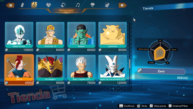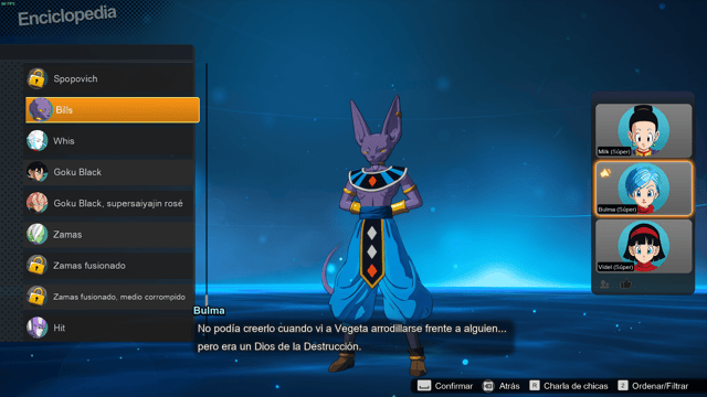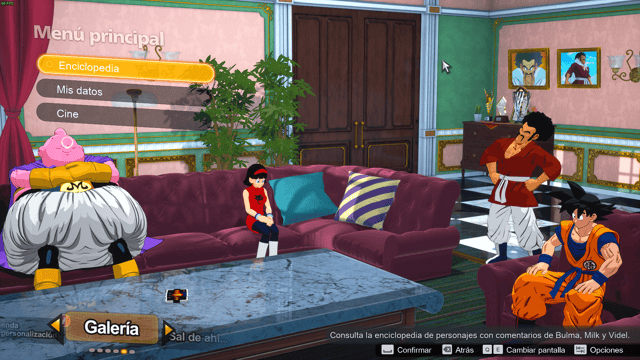 Tenemos un montón de cosas adicionales en diferentes opciones, además de la tienda donde podremos conseguir desde personajes, títulos, tarjetas de personaje, etc. Podremos encontrar una sección de galería donde podremos ver partidas guardadas, una enciclopedia donde podremos ver lo ya obtenido con la particularidad de escuchar a Bulma, Milk (Chi-Chi) y Videl hablando y dando comentarios de los diferentes personajes que tenemos.