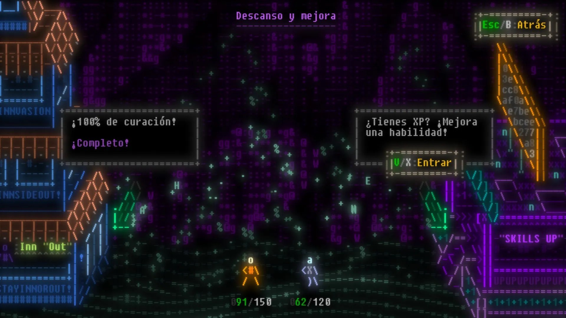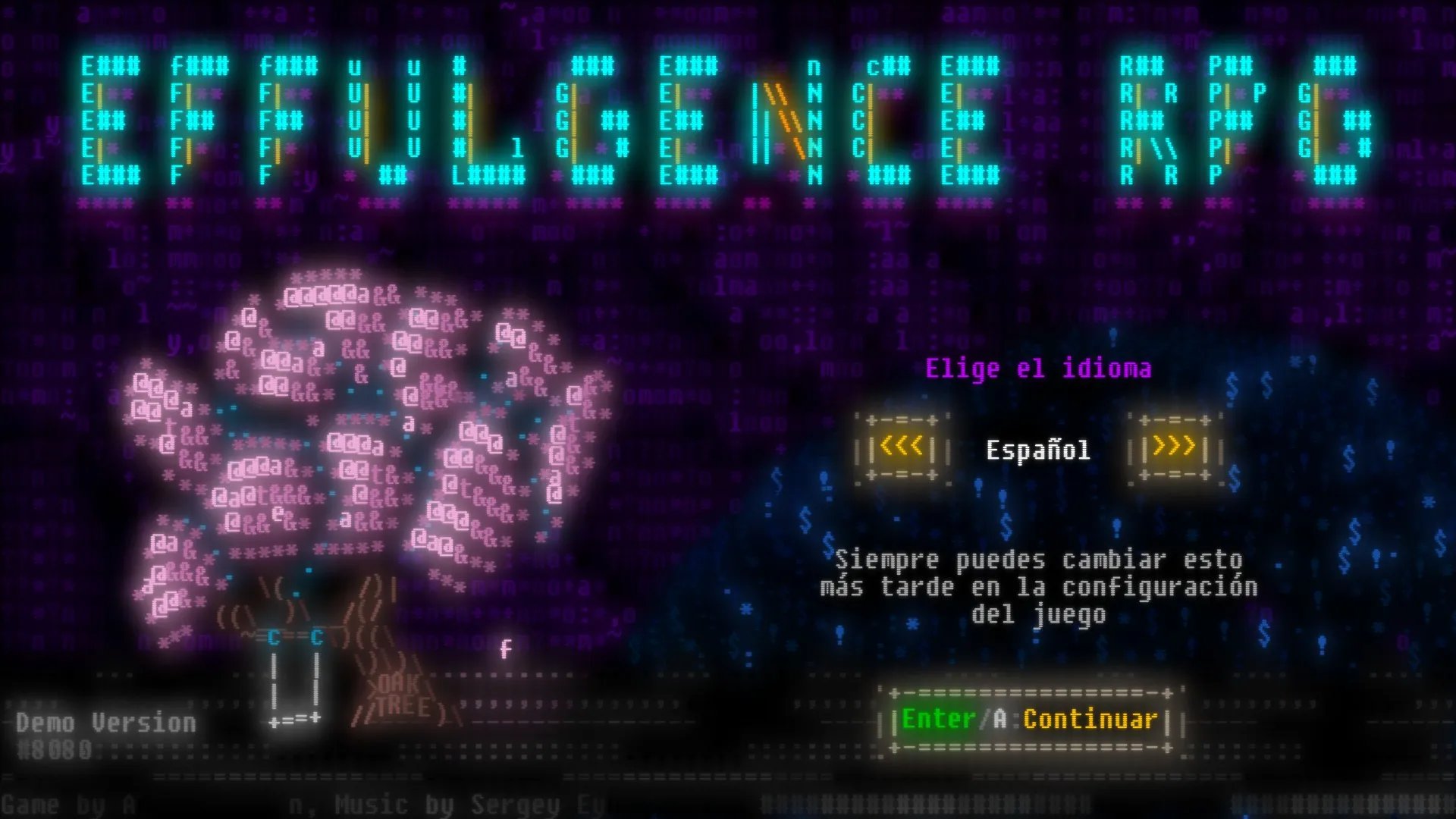 El segundo aspecto que llama la atención inmediatamente al iniciar el Effulgence RPG es su estilo de arte. Con personajes, entornos, interfaz y cuanto elemento visual existe creado en ASCII, un código de caracteres basado en el alfabeto latino, y que gracias a su proximidad geométrica, permite crear dibujos, haciendo uso de diferentes letras, números y caracteres especiales. Esto en combinación con sus vibrantes colores neón, que nos transportan a una estética retro.