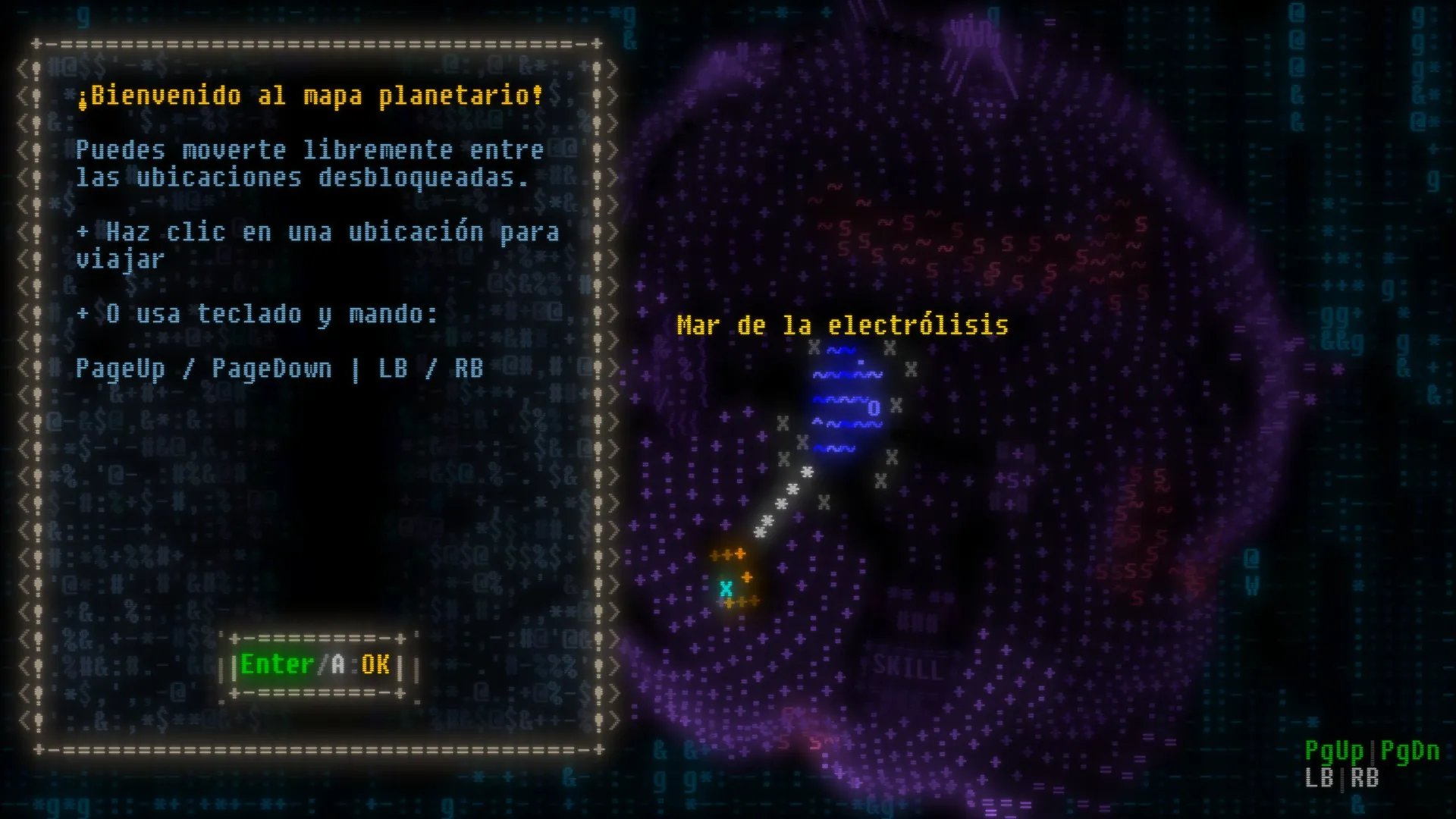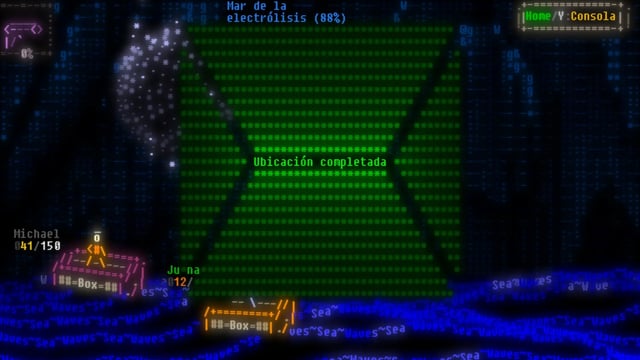 Todo el mundo está creado con este estilo en mente, y cada locación presenta una oportunidad para deleitarse con las invenciones en ASCII; autopistas, bosques, ciudades, océanos y demás. Nos encontraremos con tiendas para conseguir armas, estaciones para mejorar las estadísticas de nuestros personajes, acertijos y un interesante minijuego que involucra cartas y un dado de 20 caras.