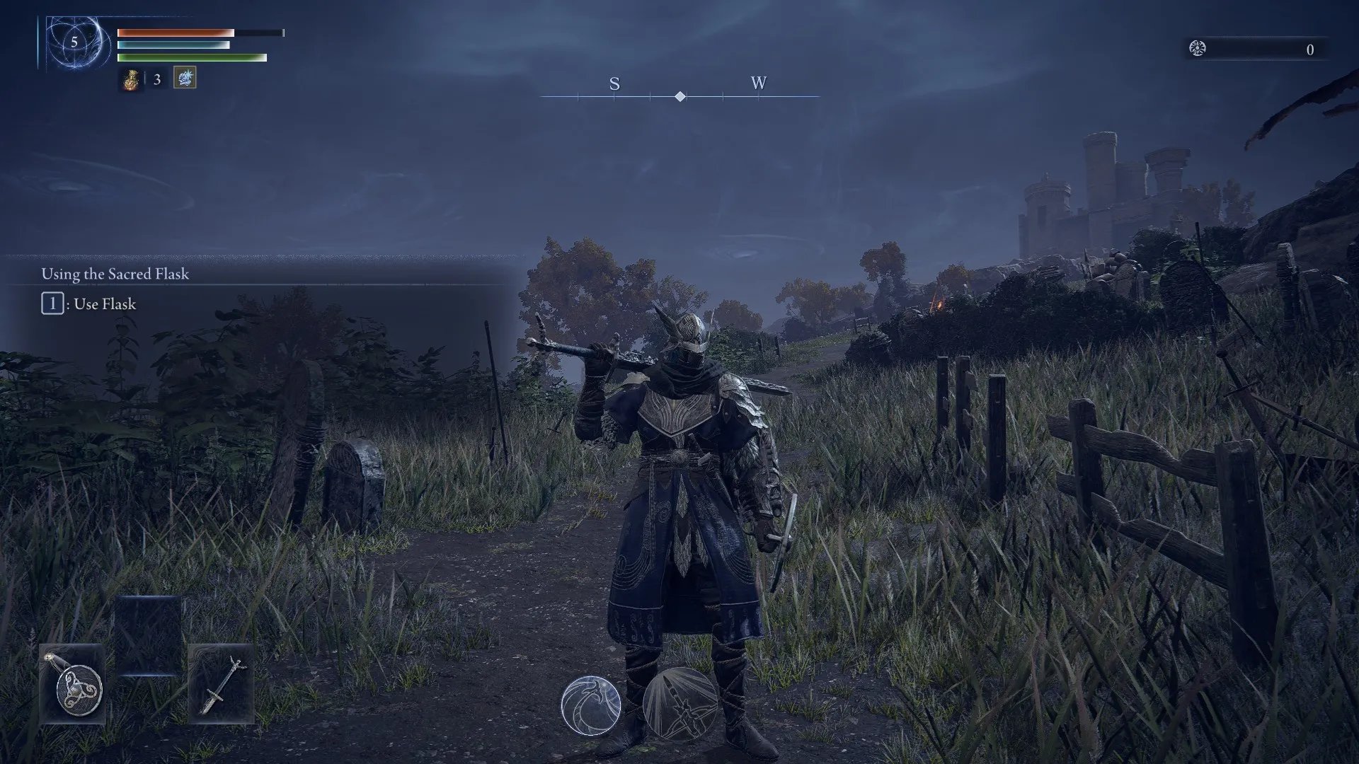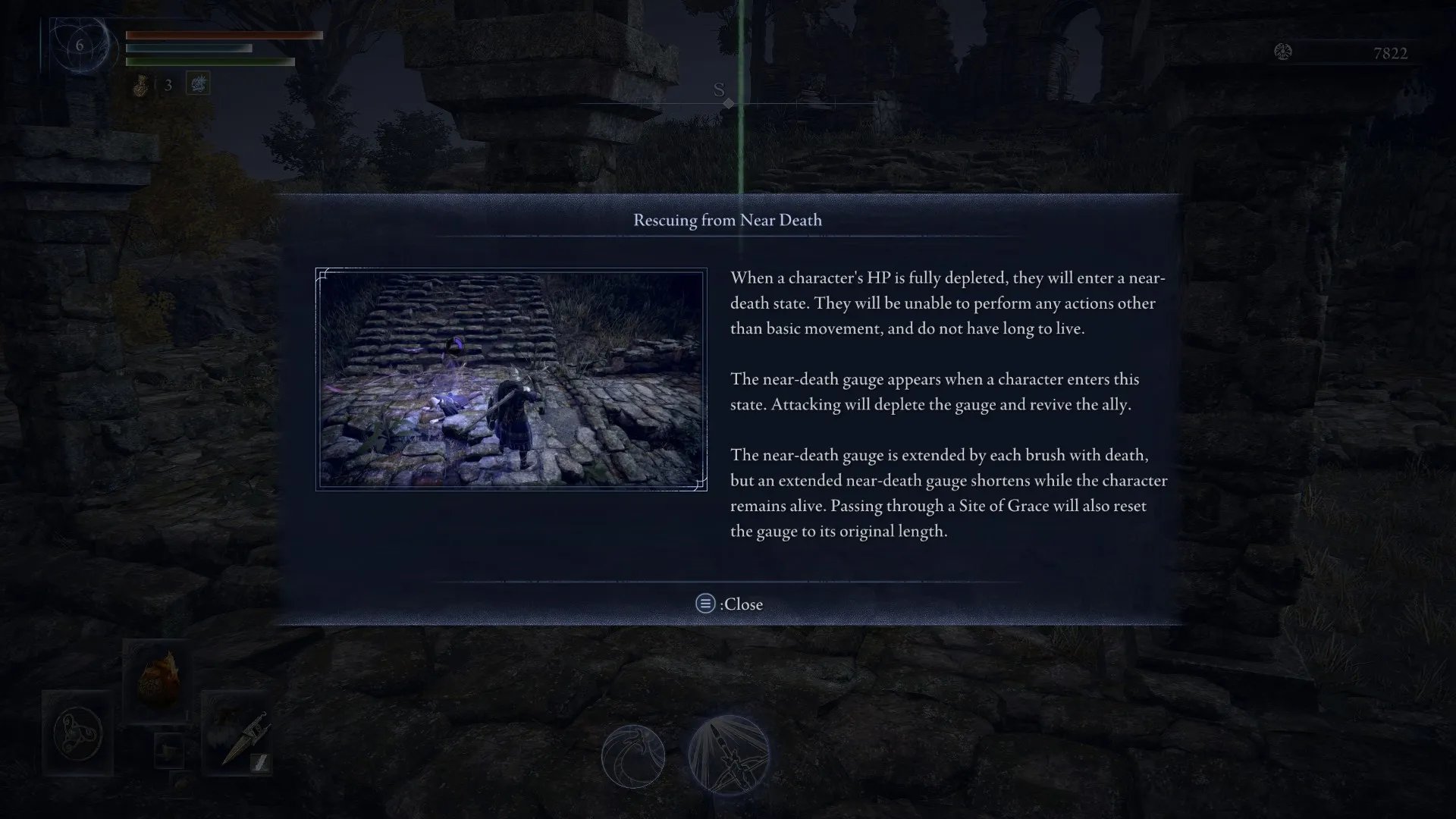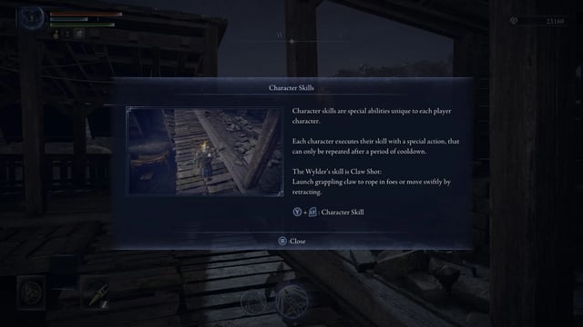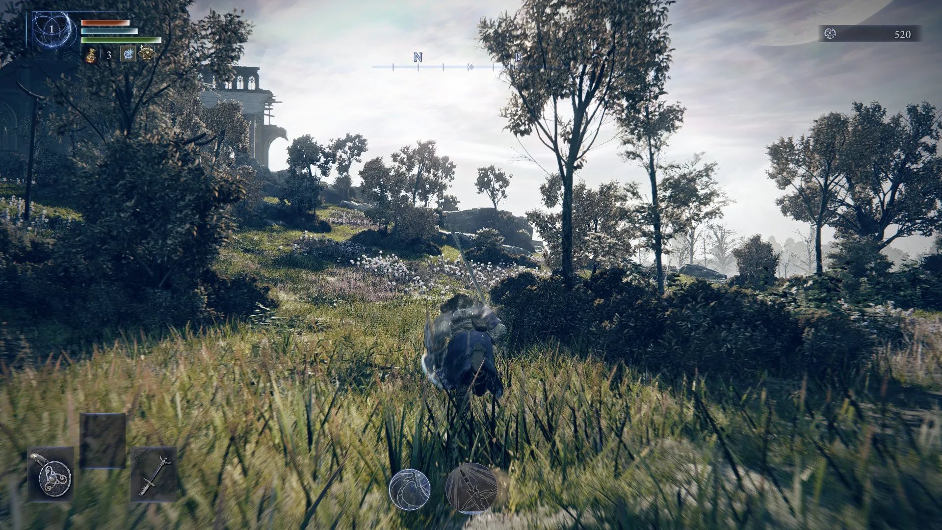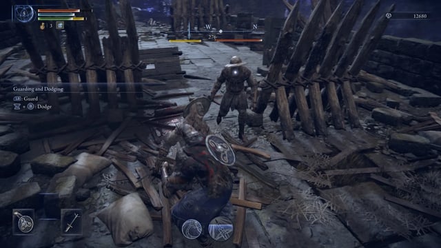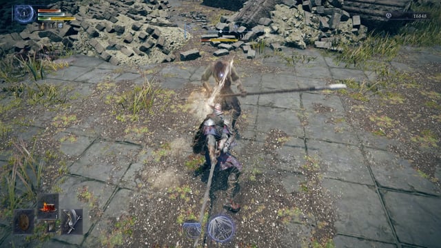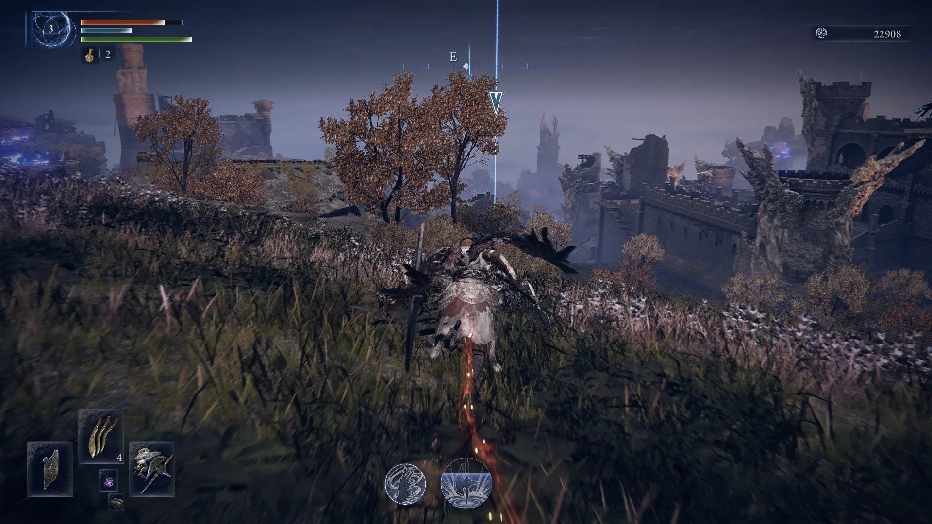 Tenemos nuestra barra de vida, de puntos de enfoque y de estamina. También contamos con nuestra poción de curación (limitado a 3 usos, pero que podremos conseguir más en el mapa) y nuestros consumibles, los cuales tenemos limitados a 4 al inicio. Y contamos con un salto doble en paredes y un super sprint para acelerar nuestro recorrido en el mapa.