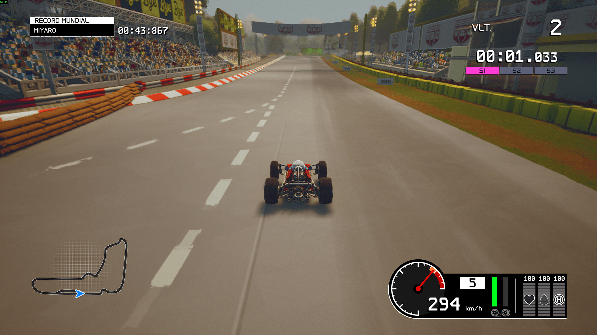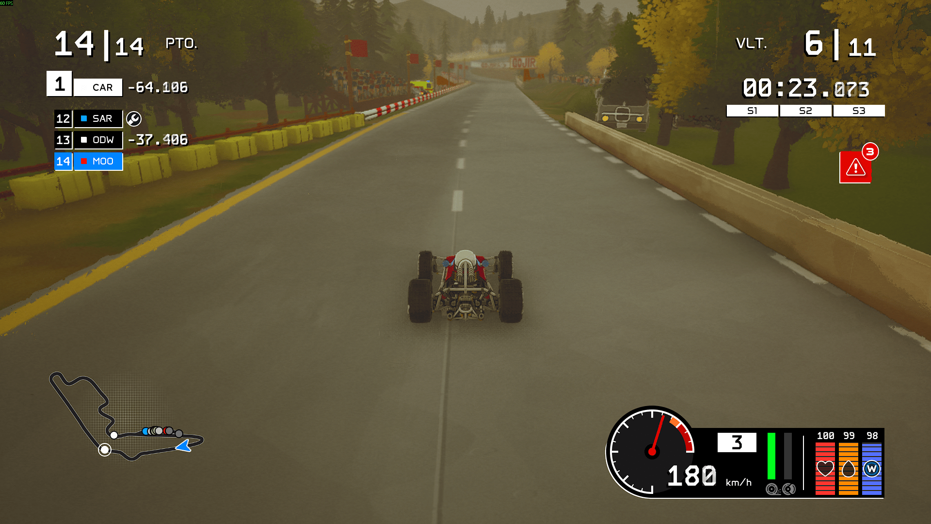 Hay tres barras las cuales en el modo simulación nos indican que dan dañado está el automóvil, cuanta gasolina tenemos y la durabilidad de los neumáticos. Claro que nuestro equipo nos anunciara con mensajes de texto en pantalla advertencias del estado de cada uno o al momento del cambio de clima. En el modo arcade solo debemos preocuparnos por el tipo de neumáticos pero sin el desgaste y por llenar el tanque de gasolina.