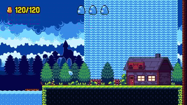 La historia es deliberadamente mínima y sin diálogos, algunos símbolos nada más que evocan los sentimientos. Controlaremos a un slime celeste, una criatura gelatinosa que avanza de izquierda a derecha y cuya única acción es saltar. Mientras un conflicto mayor se desarrolla en segundo plano un héroe, un villano y un reino en guerra, Slimey atraviesa el mundo casi como un testigo accidental. Su motivación es simple y entrañable: llegar a la casa de sus amigos a visitarlos, incluso si eso implica cruzar campos de batalla, trampas mortales y escenarios hostiles llenos de plataformas.