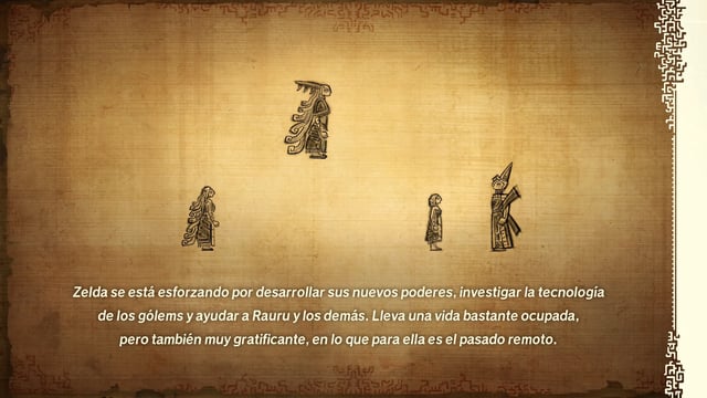 La narrativa sigue a Zelda transportada al pasado fundacional de Hyrule, aliándose con el rey Rauru, la reina Sonia y Mineru para combatir la traición de Ganondorf, culminando en sacrificios épicos que explican murales y sellos del lore. Personajes jugables como líderes tribales y el Caballero Constructo ofrecen estilos únicos, con diálogos que profundizan bonos y motivaciones en cinemáticas pre-renderizadas.
