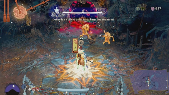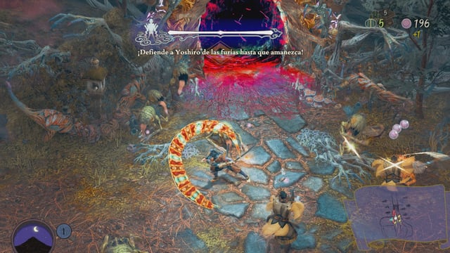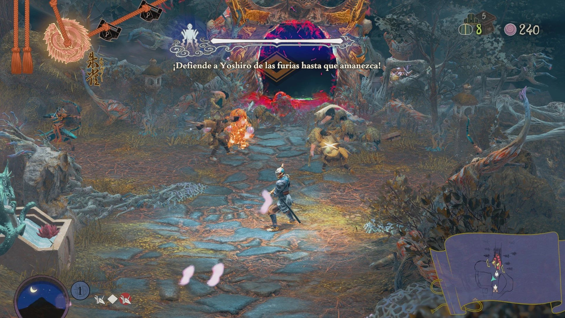 Cuando llega la noche, las furias aparecerán en oleadas y buscarán atacar a Yoshino; para defenderla, Soh podrá combatir de frente a las criaturas usando su espada mística, la cual tiene golpes en combo básicos y rematadores de danza. En dado caso que algún monstruo se este acercando a Yoshino, Soh puede pausar el juego rápidamente y reasignar a los aldeanos a distintas zonas. Una vez finalizada la noche, iniciará el ciclo de día, y Soh podrá terminar sus tareas hasta llegar a la puerta Tori.