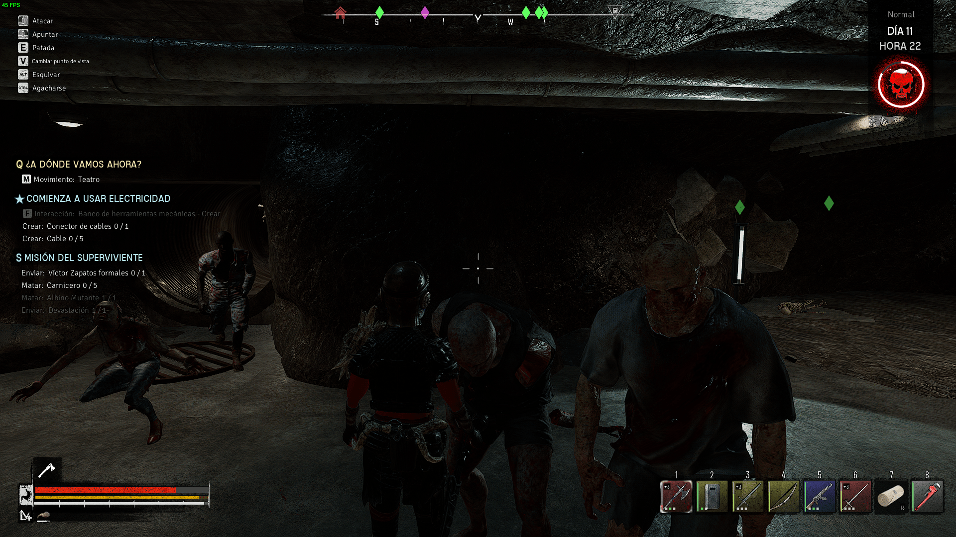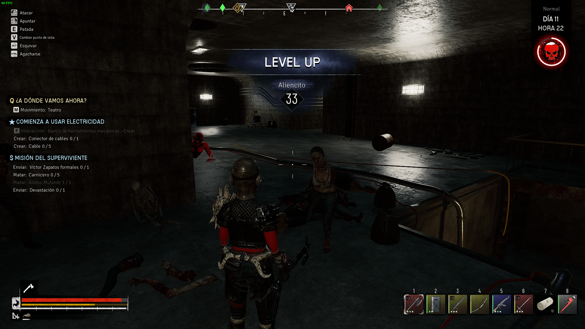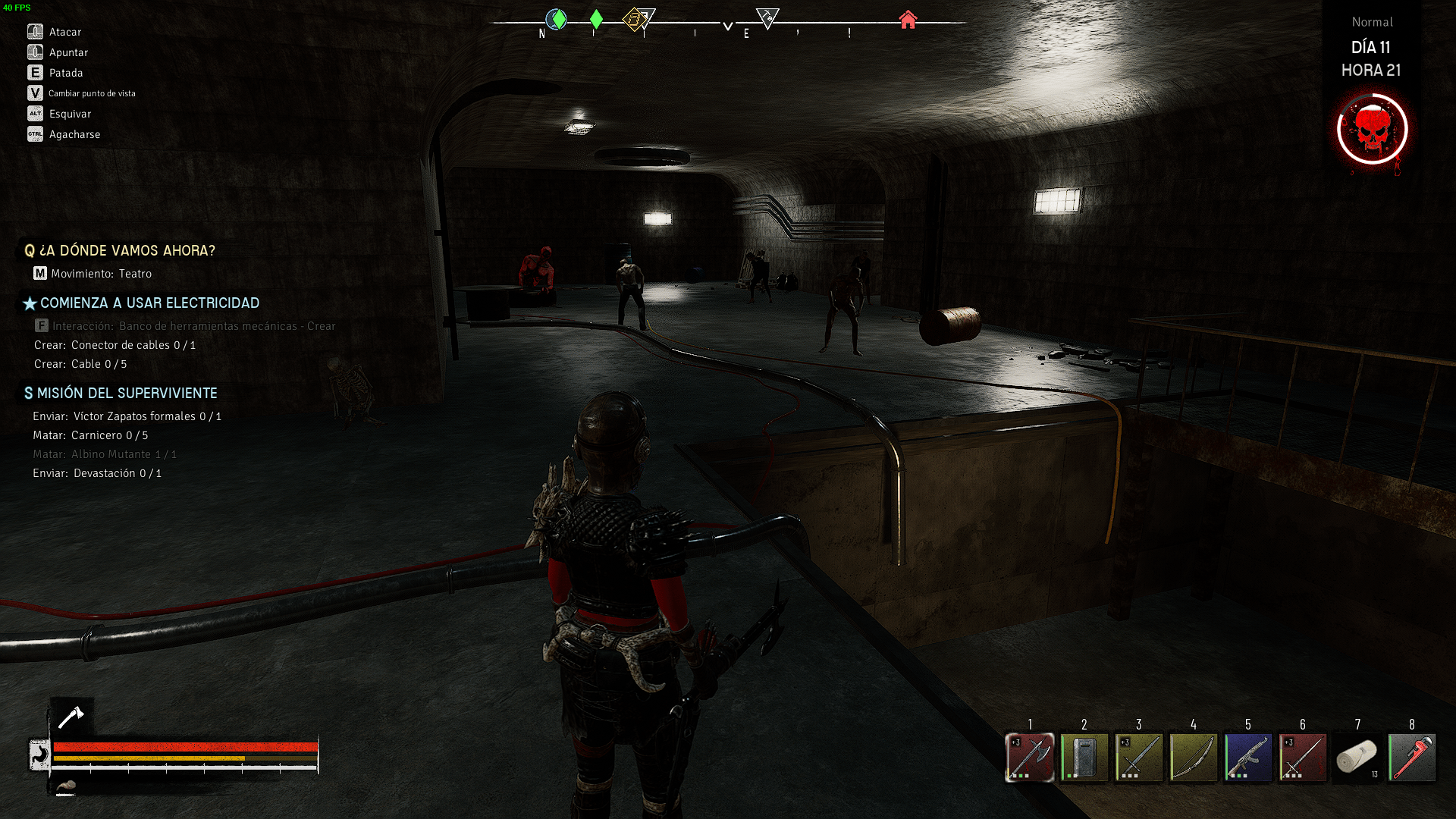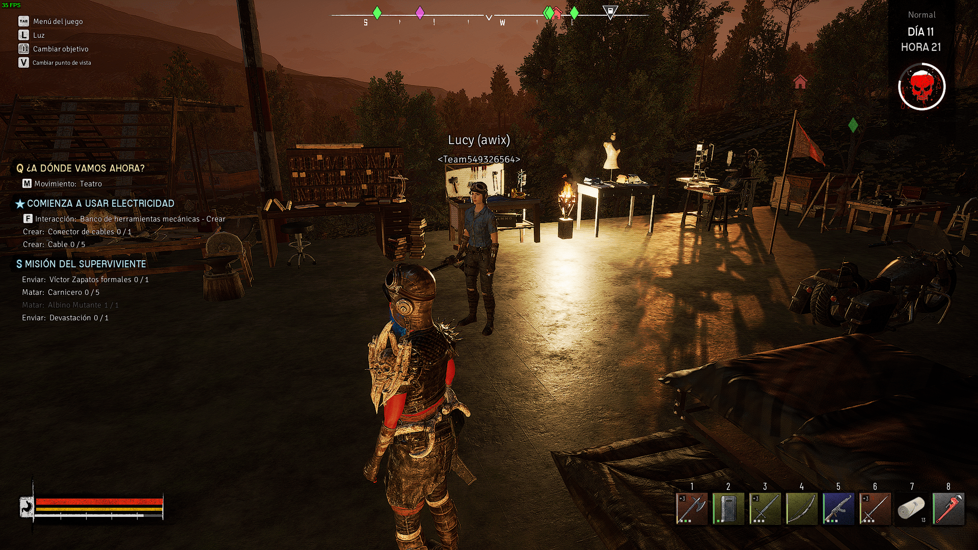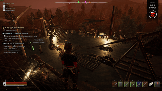 Tu nivel de hambre determina tu salud y resistencia máximas en 4 etapas. Llenarlo al máximo te permite aguantar más golpes y correr por más tiempo, por lo que es fundamental que lo hagas. Sin embargo, la comida no es fácil de conseguir, y tanto la agricultura como la caza son más confiables que buscar la ocasional lata mientras saqueas. Ahí es donde entra el uso de la moneda en las tiendas o el subir los estatus de tu personaje y la investigación conjunta tambien.