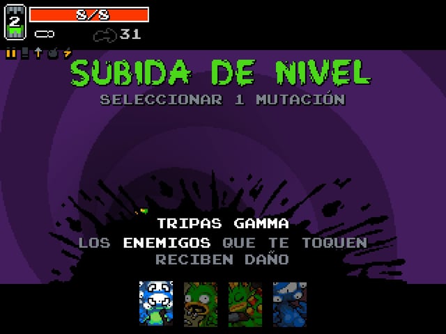 El sistema de progresión gira en torno a los Rads, puntos de experiencia que sueltan los enemigos al morir y que desaparecen rápidamente si no se recogen. Esta simple decisión de diseño fuerza al jugador a asumir riesgos constantes: avanzar para subir de nivel o jugar seguro y perder la oportunidad de mejorar. Al pasar cada nivel, el juego presenta cuatro mutaciones aleatorias que pueden alterar radicalmente el estilo de juego, desde mejoras defensivas y aumentos de vida hasta habilidades más agresivas dependiendo del modo de juego que nos guste, como generar explosiones con los cadáveres o atravesar paredes. El azar es un factor clave, pero la lectura del contexto y la anticipación de las próximas zonas marcan la diferencia entre una carrera prometedora y una muerte prematura.