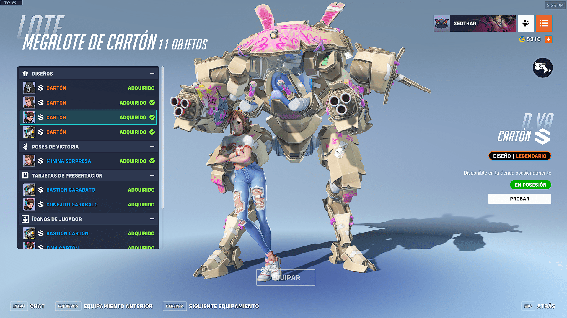 D.Va de cartón la cual en su mayoria es de cartón, posee ventiladores en sus armas, una almohada en la parte de atras, su arma tambien es de cartón y cinta adhesiva. La ropa de D.Va es un jean roto y una camiseta muy sencilla. Viene con un icono y tarjeta de presentación.