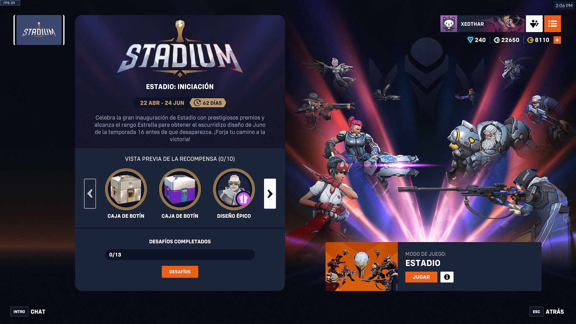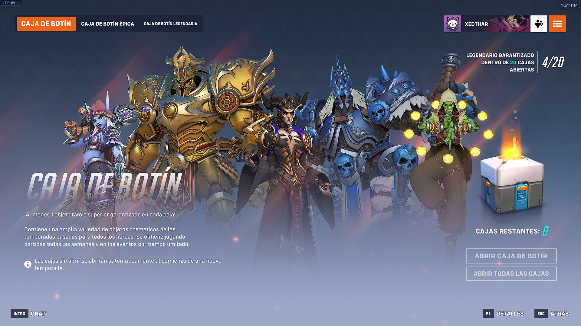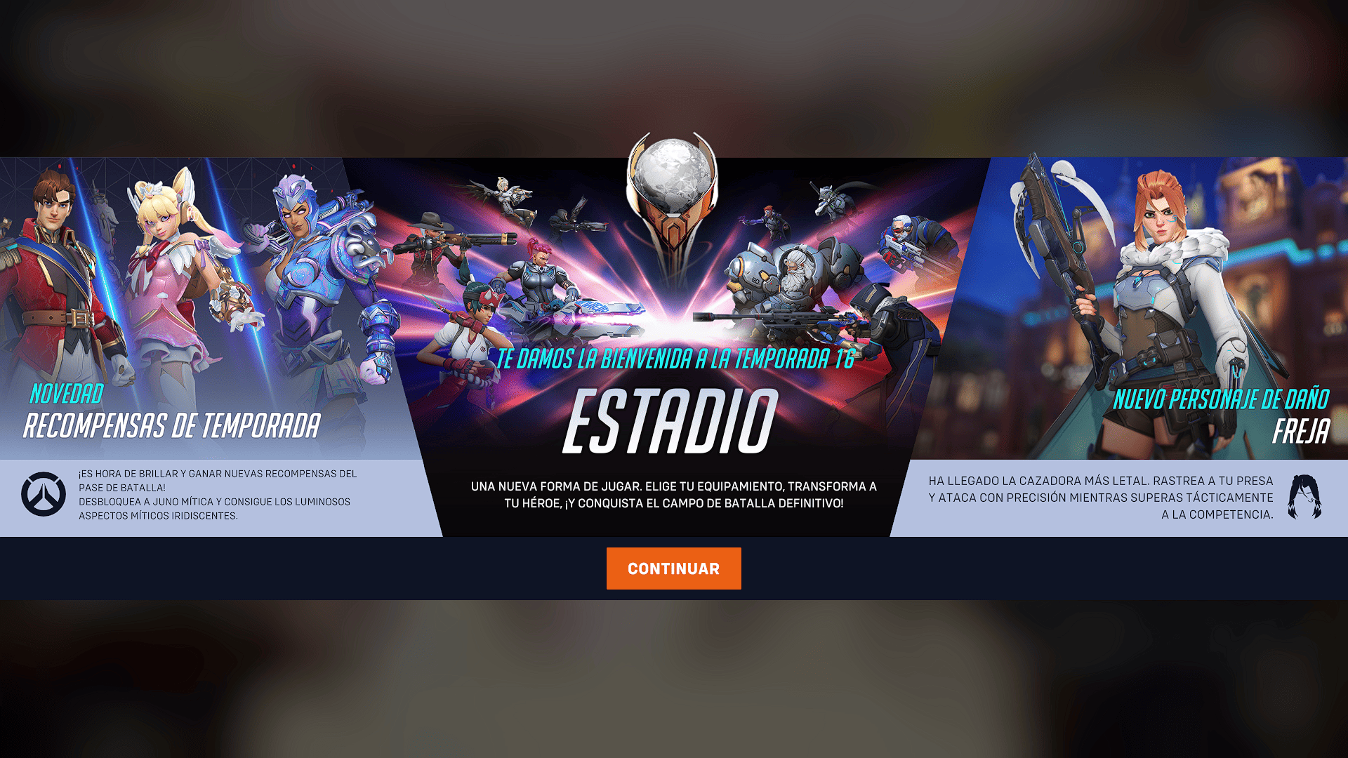 La temporada anterior al ser el relanzamiento había 2 desafíos de completar partidas para ganar 10 cajas y adicionalmente 3 cajas por jugar más partidas semanalmente. Ahora serán solamente 3 cajas semanales por jugar 27 partidas con puntuación doble al ganar una de ellas en cualquier modo. Pero con los desafíos de estadio tendremos más opciones. además, ocasionalmente en transmisiones o misiones de discord se podrán conseguir algunas cajas adicionales. Seguiremos con el conteo de todas las cajas que tengamos, al abrir la caja numero 20 siempre se tendrá garantizada un aspecto legendario y adicionalmente tendremos la opción de sacar de las ultimas colaboraciones con los demás juegos de blizzard, entre ella están las de Warcraft y Diablo.
