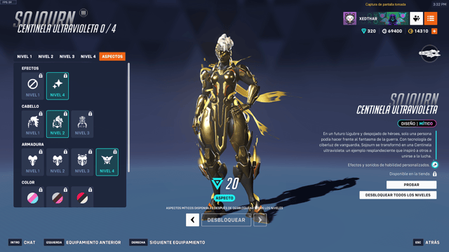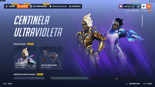 En esta ocasión el aspecto mítico es para Sojourn con el Centinela Ultravioleta, con 4 niveles que cambian sus colores, su cabello, sus hombreras y nos dan una chispa resplandeciente que genera unas cintas en su espalda. Y ya como se volvió habitual, viene con sus aspectos adicionales que son los colores dorados e iridiscentes, con un valor extra de prismas para conseguirlo.