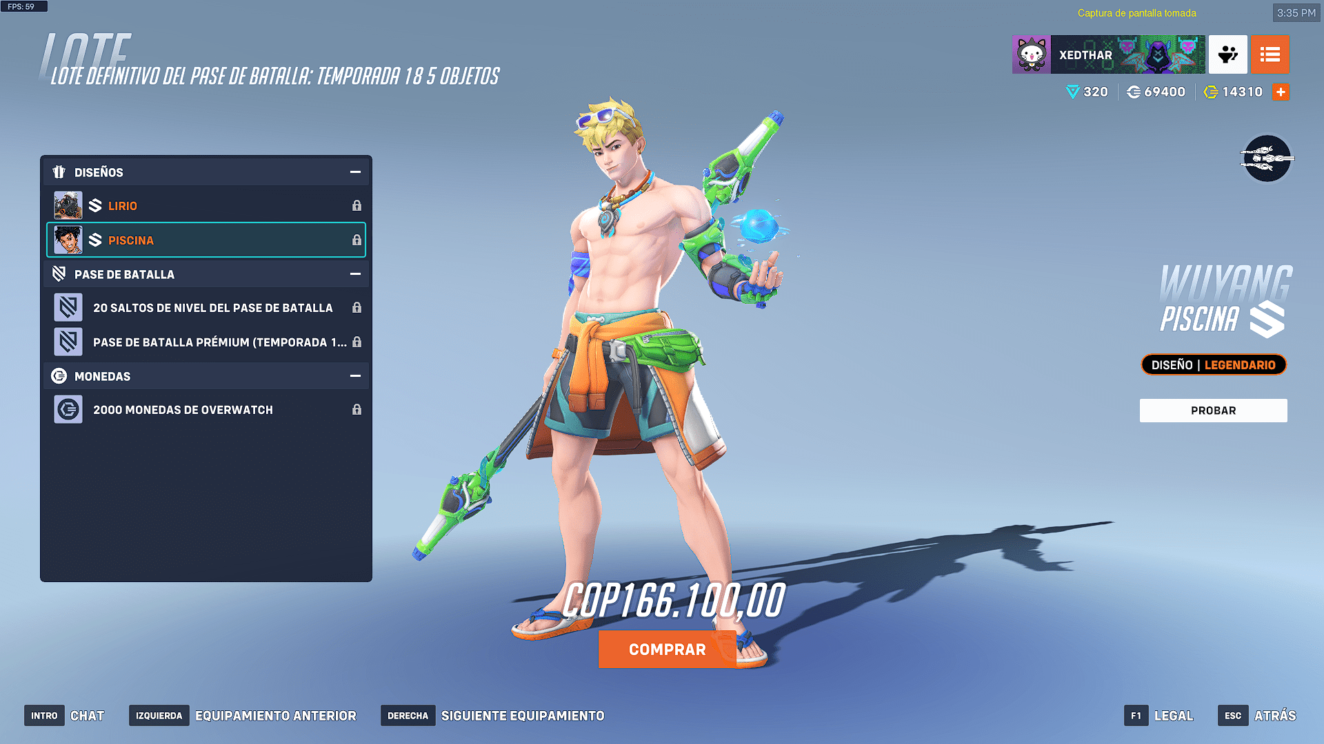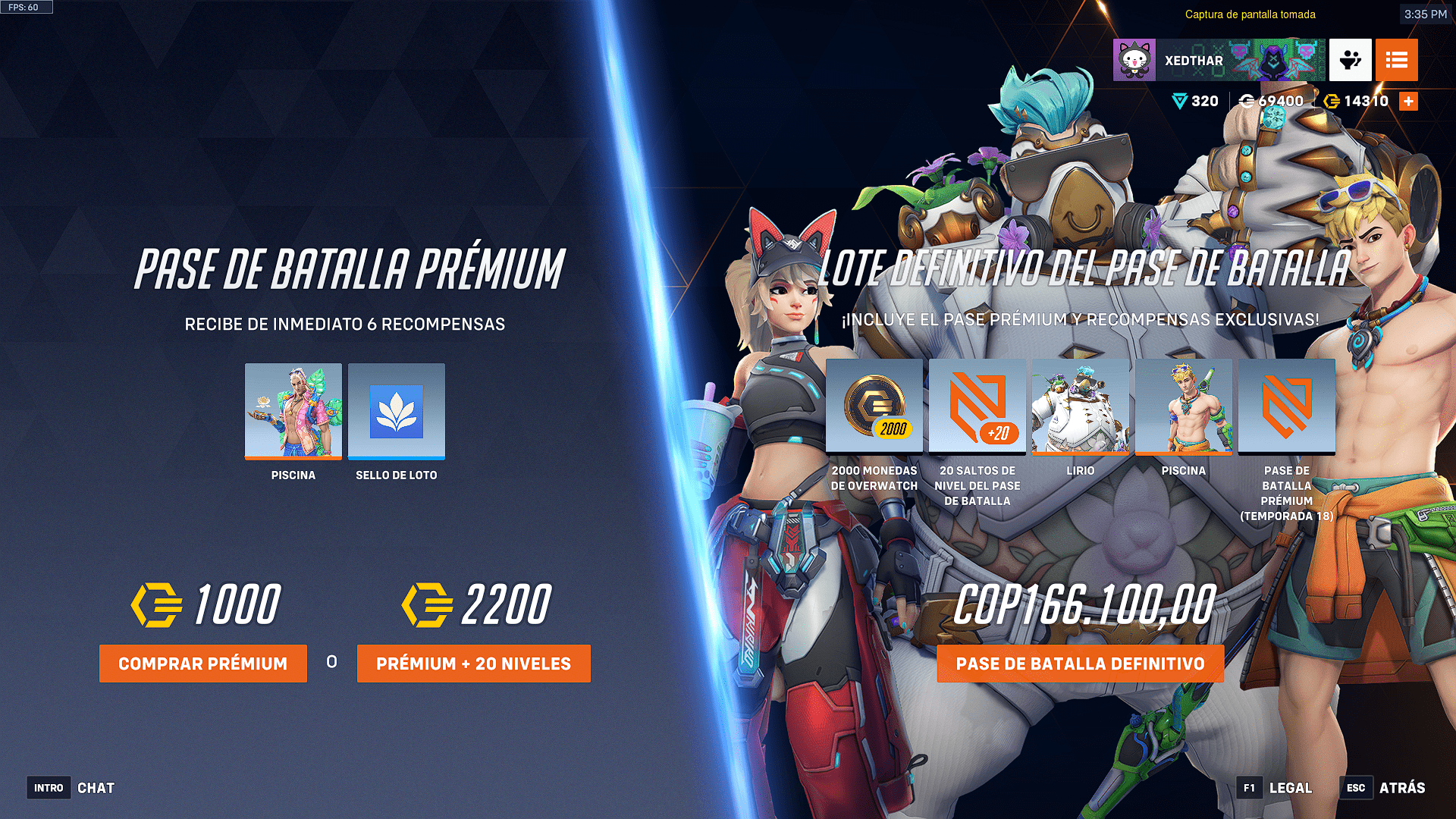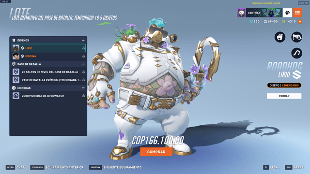Como ya estamos acostumbrados en el pase de batalla tenemos 3 opciones para adquirirlo, la primera el pase premium por un valor de 1000 monedas de overwatch o si se desea saltar 20 niveles inmediatamente 2200 monedas de overwatch y el lote definitivo que solo se puede conseguir con dinero por un valor de 166.100 COP o un aproximado de $ 40 dólares, el cual viene con el pase premium, los 20 saltos de nivel del pase y dos aspectos que en esta ocasión son para Roadhog llamado Lirio y para nuestro nuevo héroe Wuyang llamado piscina.