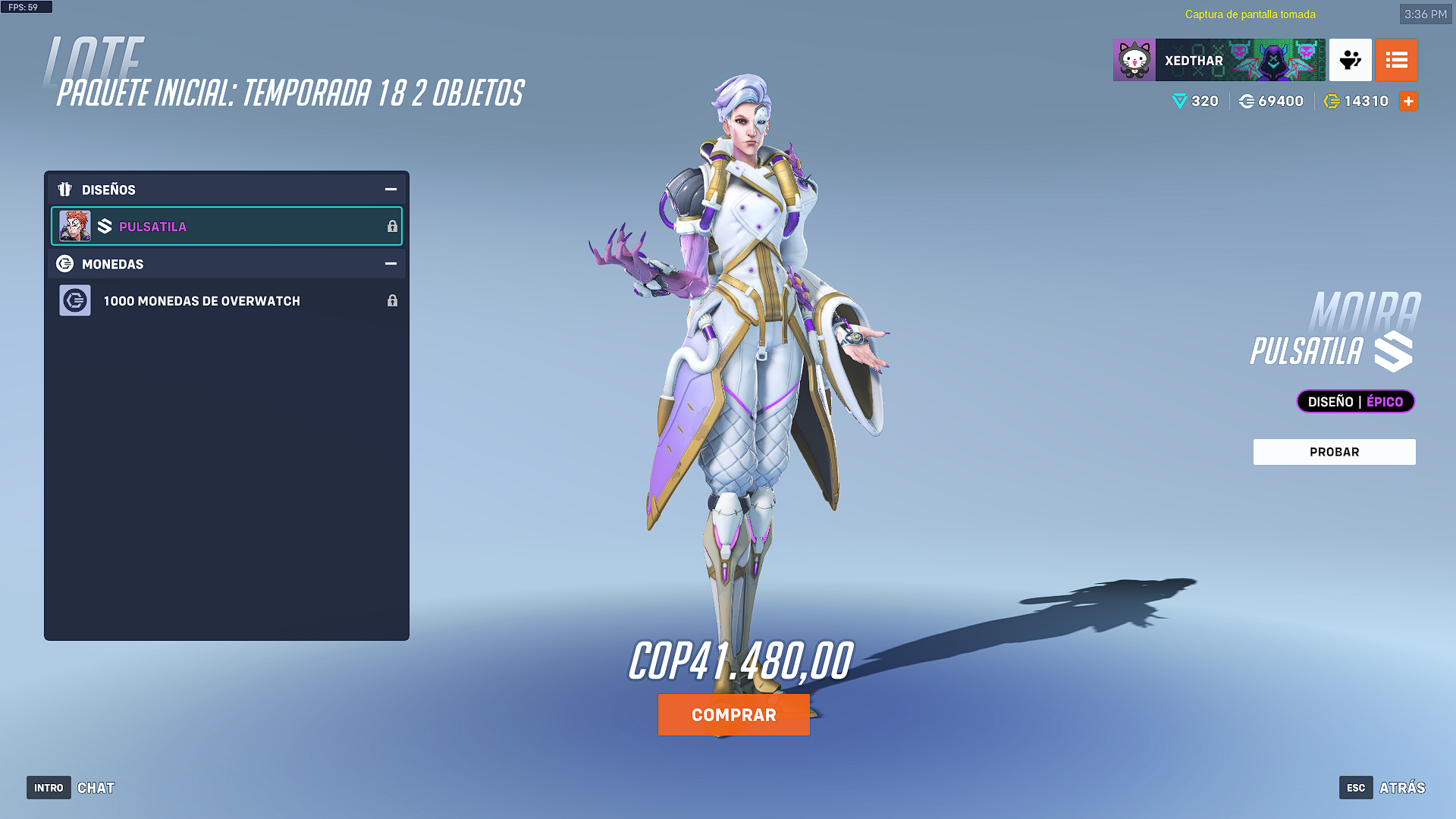 El paquete de inicio de temporada 18 que viene con 1000 monedas de overwatch y el aspecto épico Moira Pulsatila el cual resalta su cabello, su traje formal y aun más su brazo como si fuera una mutación por un valor de 41800 COP o su equivalente de $10 dólares. Si piensan en comprar las 1000 monedas de overwatch para adquirir el pase de batalla o completar para algún aspecto, la mejor opción siempre será el paquete inicial.