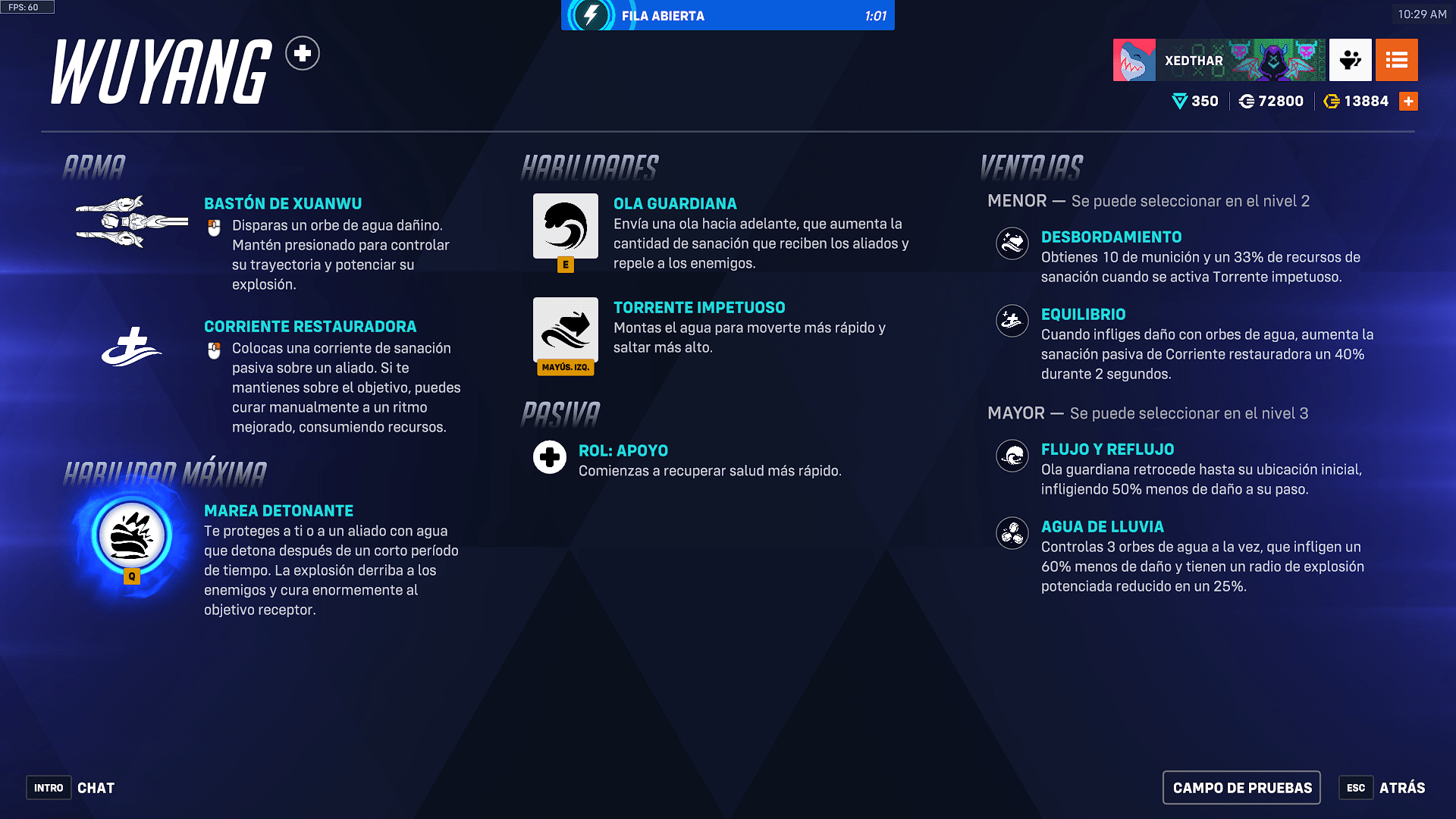 Su movilidad se potencia con Torrente Impetuoso, que le permite deslizarse sobre agua para esquivar ataques o saltar grandes distancias, y su habilidad definitiva, Marea Detonante, ofrece un refuerzo de salud antes de liberar una ola capaz de dispersar enemigos en momentos críticos adicionando una explosión a un aliado que tengamos seleccionado con la habilidad de curación.