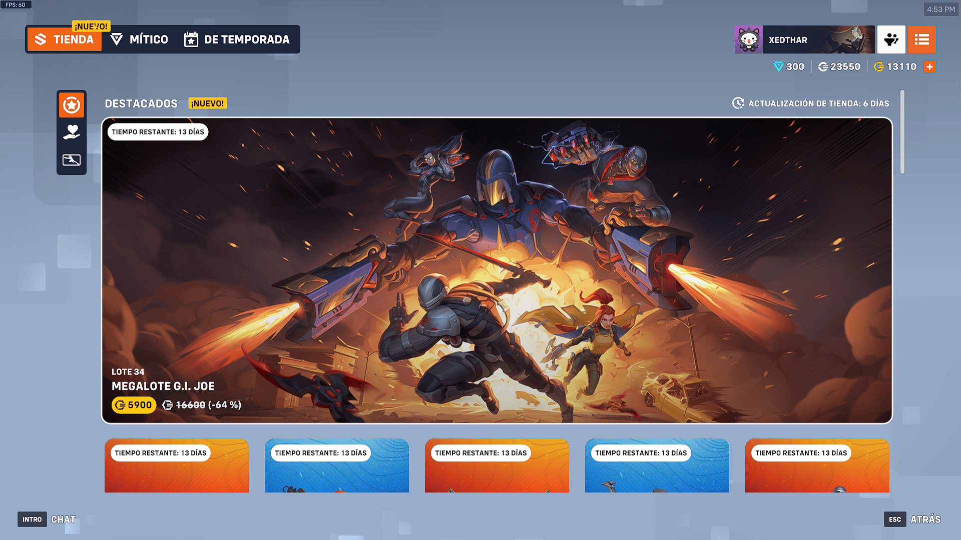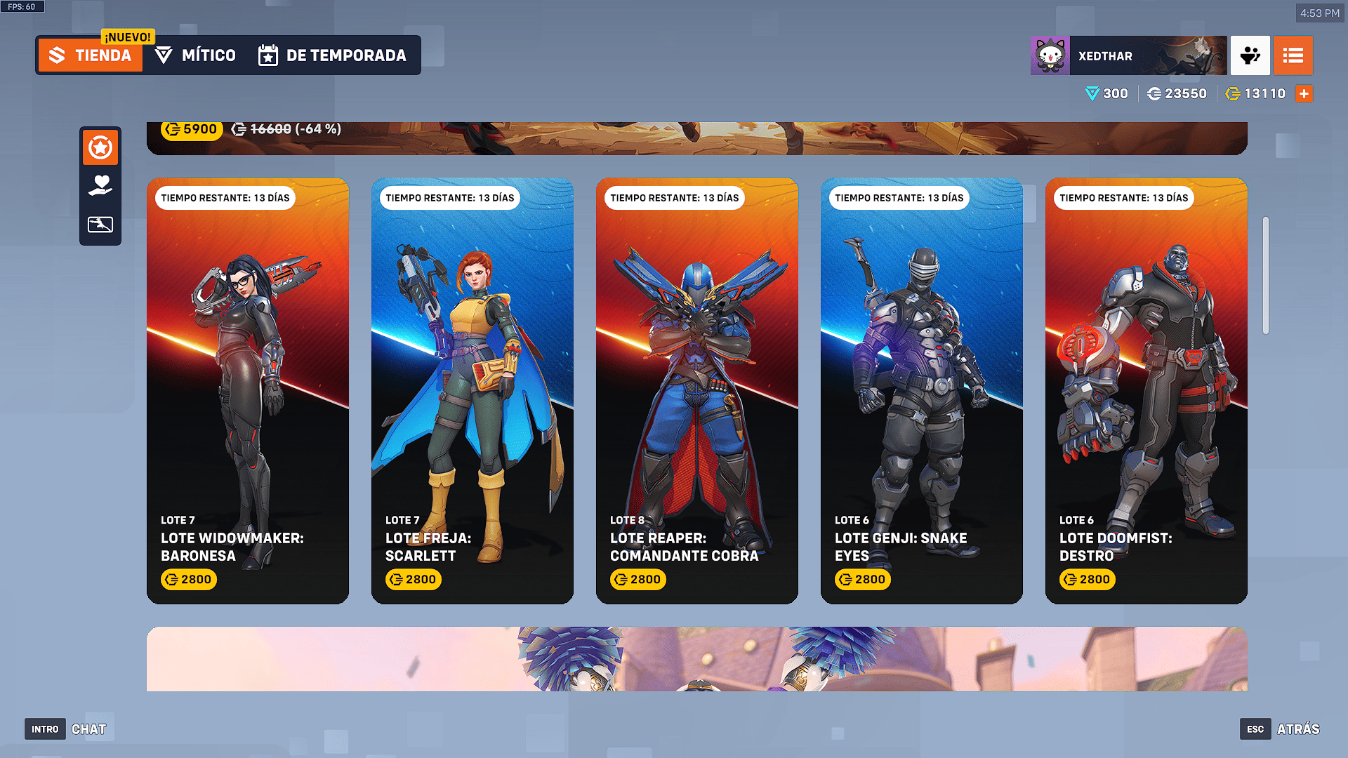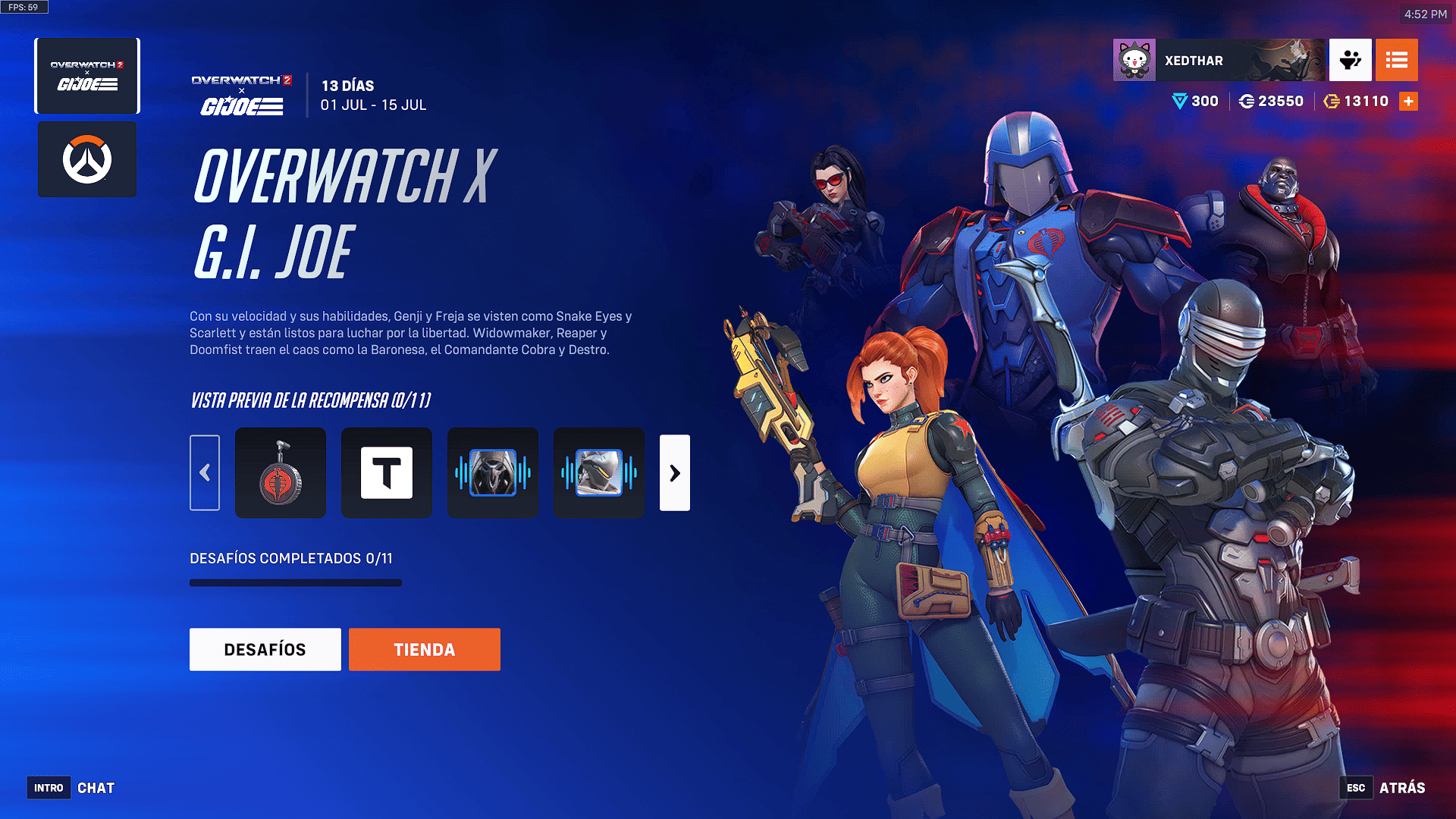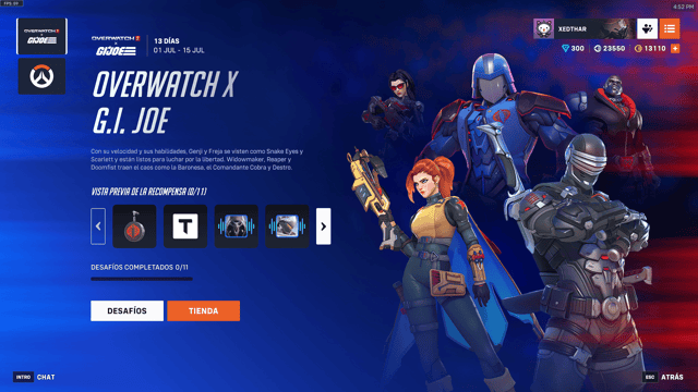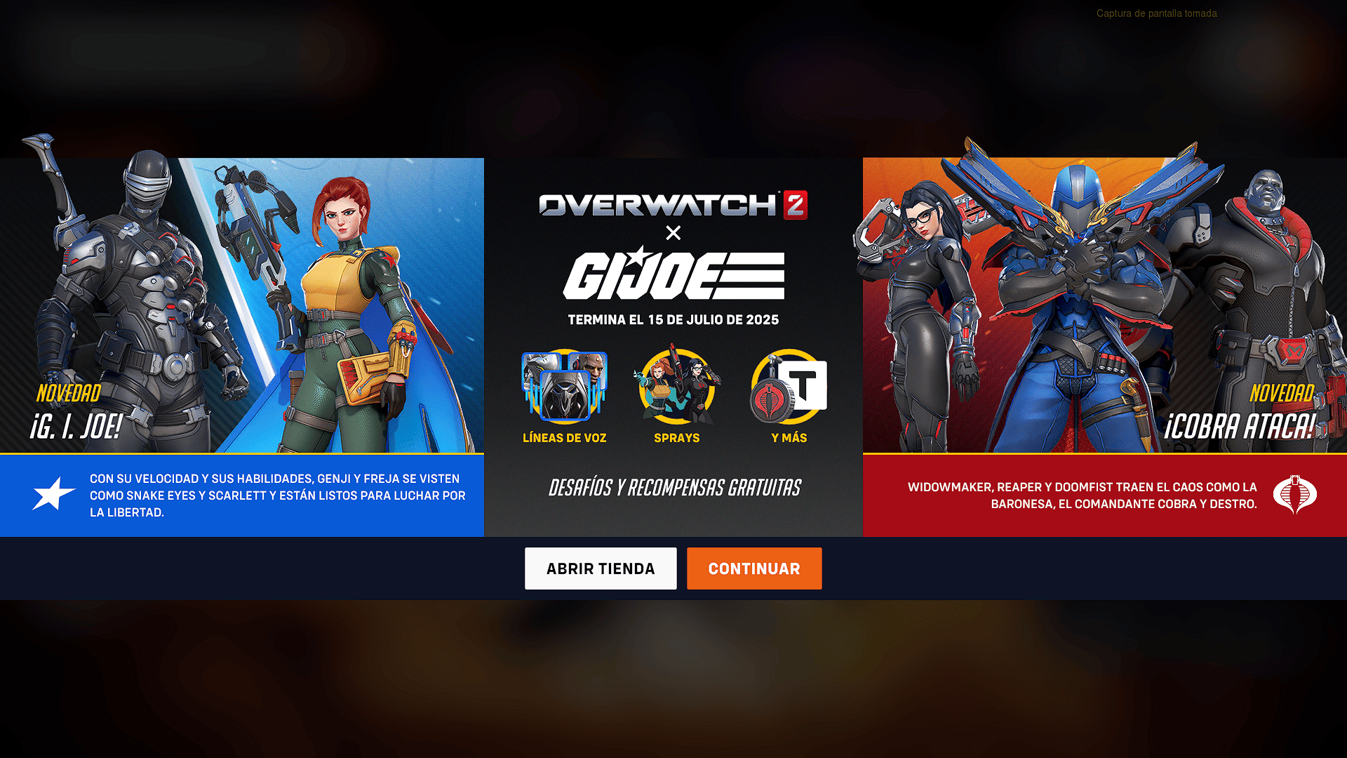 Esta colaboración que inicio el 1 de Julio hasta el 15 de Julio por un costo de 5900 monedas de overwatch, presenta cinco aspectos legendarios que transforman a algunos de los personajes más icónicos de Overwatch 2 en figuras reconocibles del universo GI Joe. La selección equilibra a héroes y villanos en un duelo simbólico entre las fuerzas del bien y del mal: