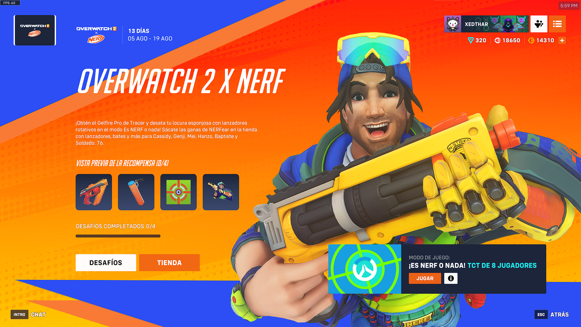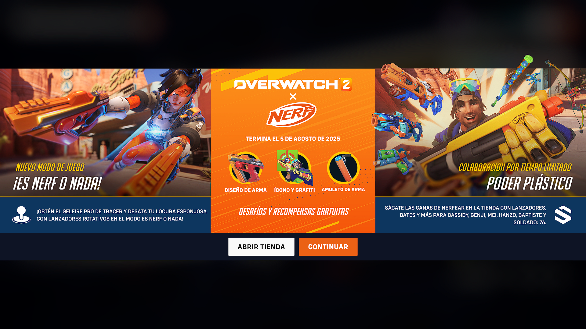 Los desafíos del evento permiten desbloquear un spray temático, un ícono de jugador, un amuleto de arma en forma de proyectil de espuma y el diseño de arma Gelfire Pro para Tracer, además de hasta 40,000 puntos de experiencia para el pase de batalla. Solo hay que hacer 100 muertes o asistencias.