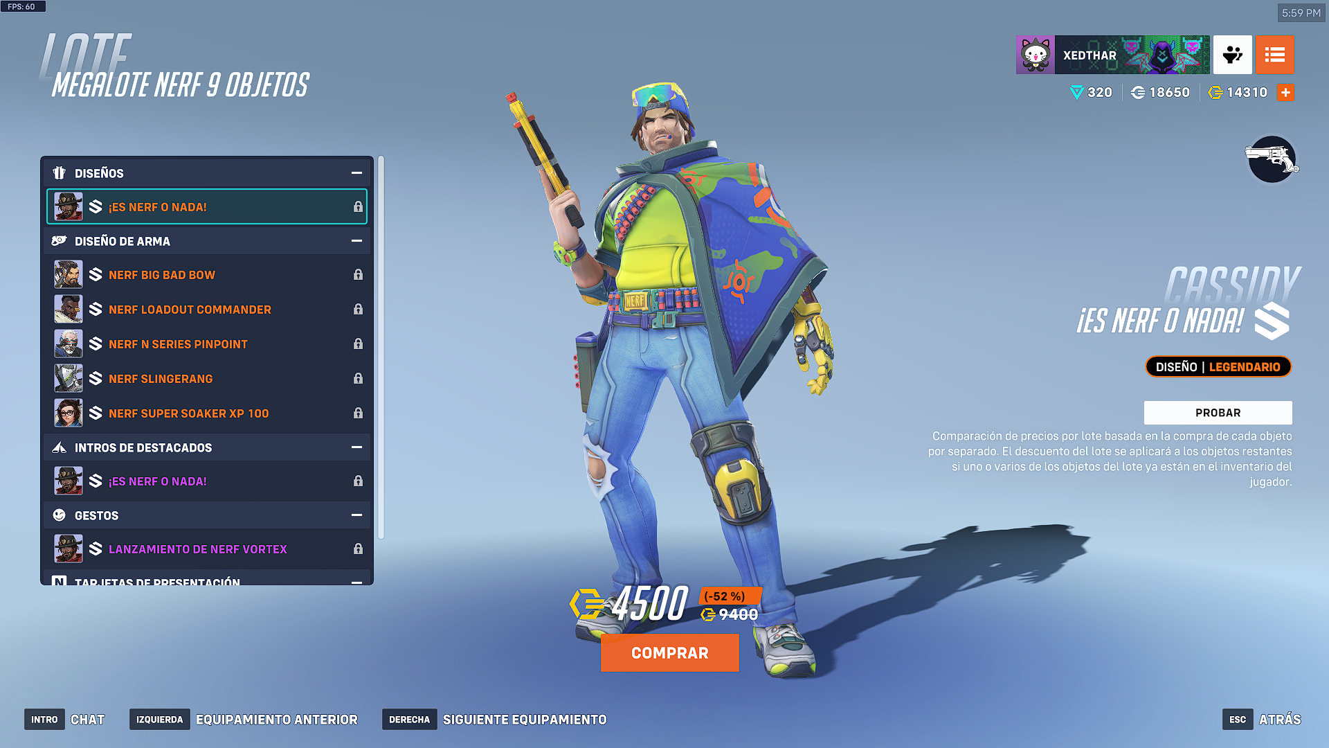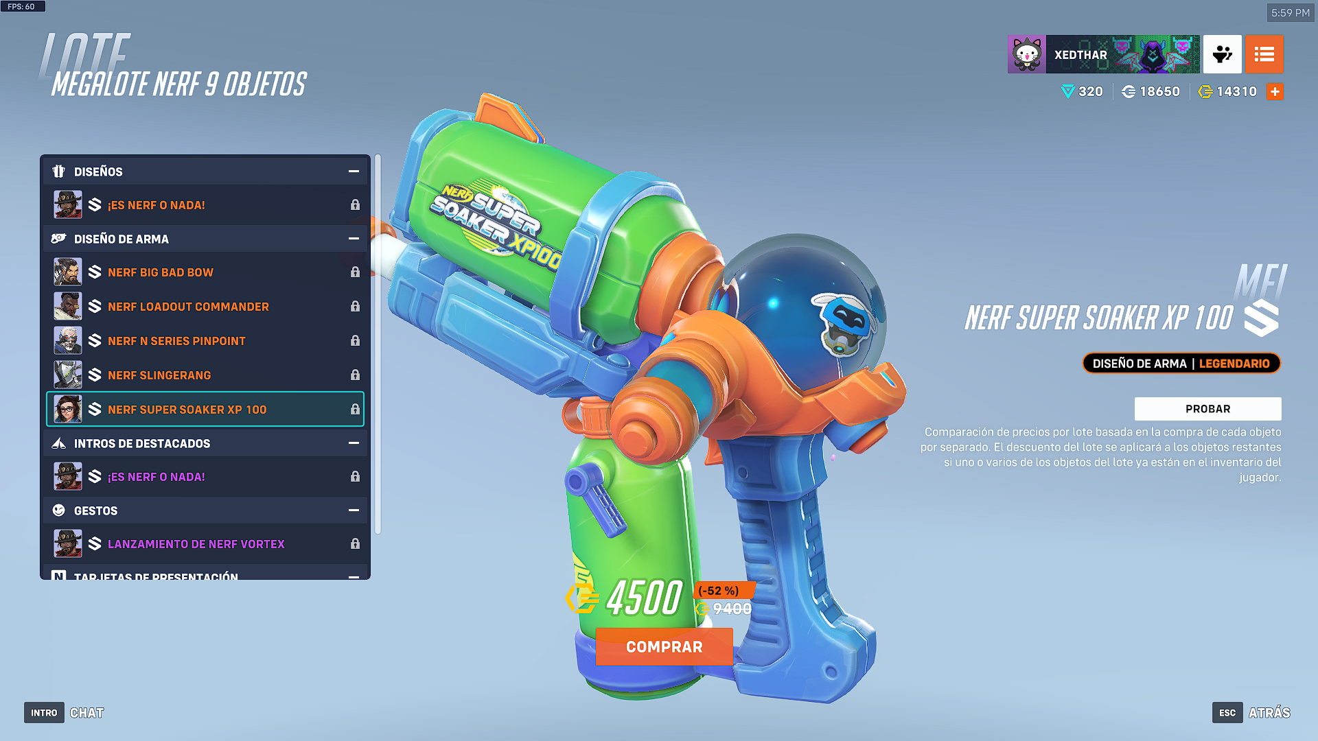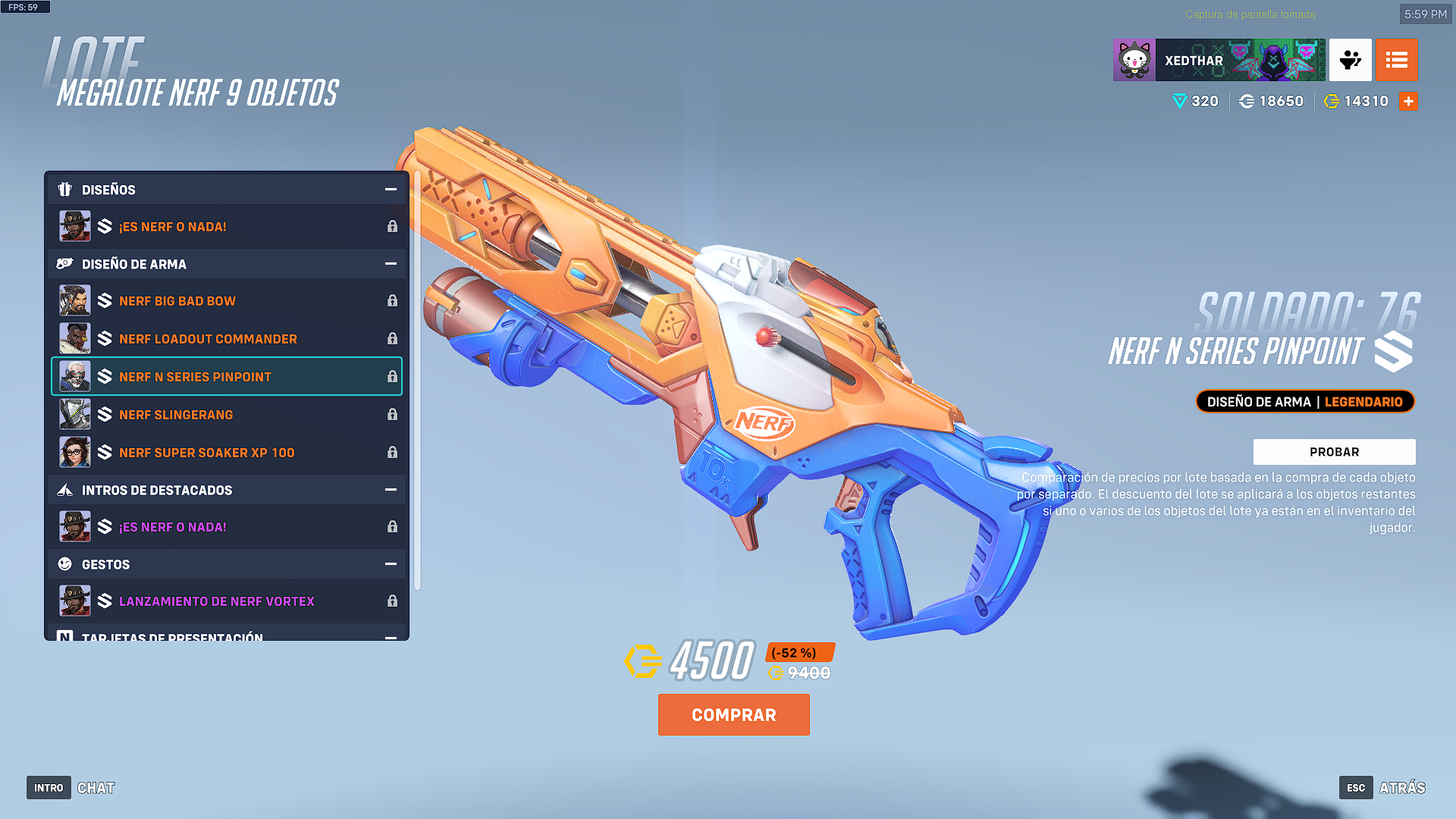 Cada una de las armas tiene el toque caracteristico de Hasbro. El paquete completo de NERF o Nada, tiene un valor de 4500 monedas de overwatch.