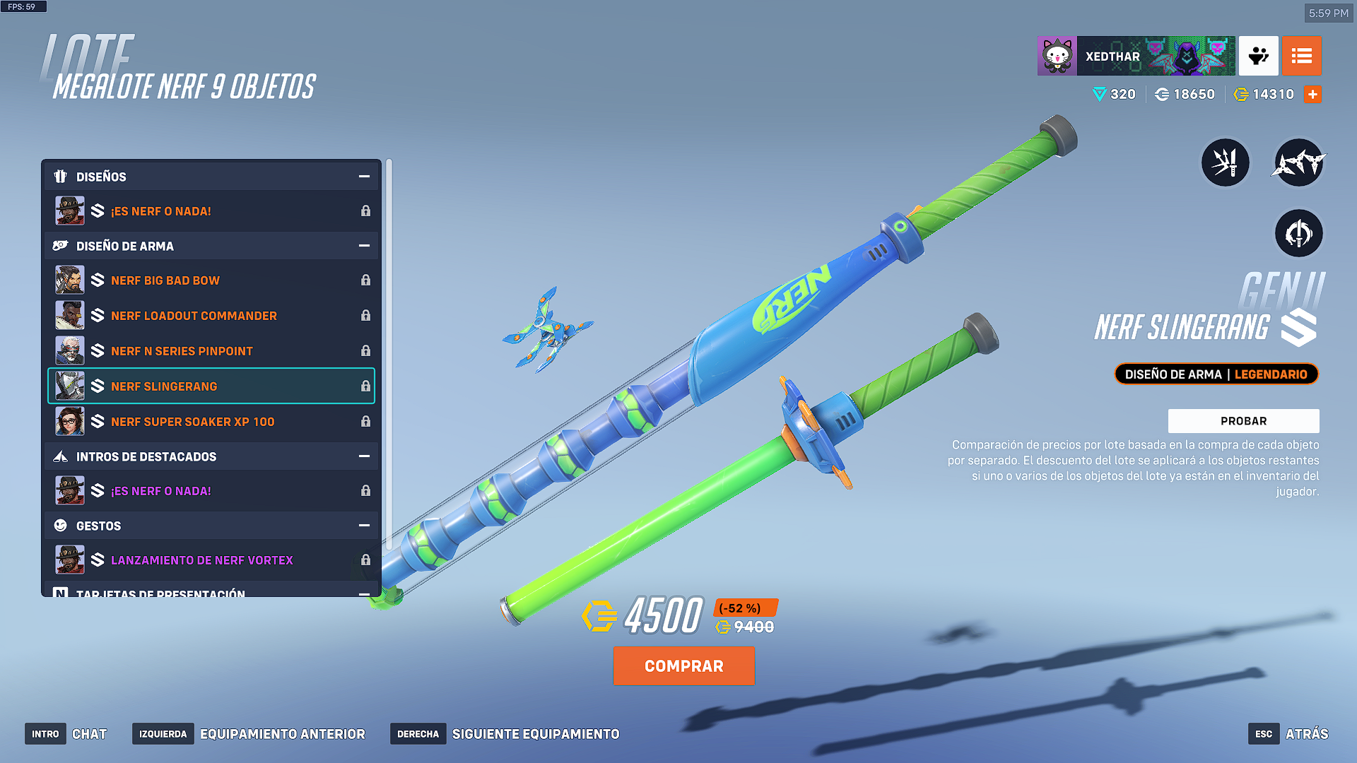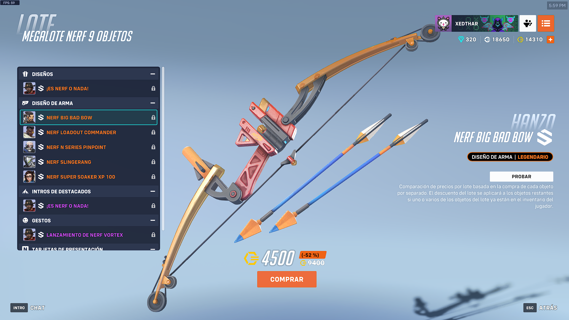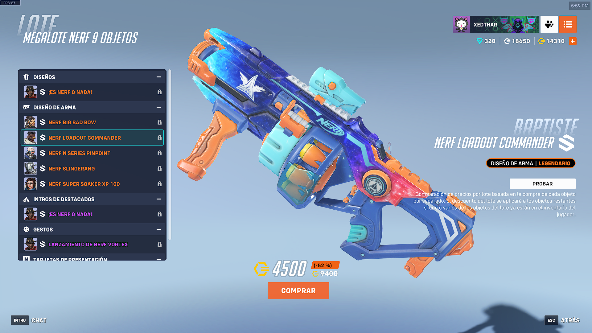 Cada una de las armas tiene el toque caracteristico de Hasbro. El paquete completo de NERF o Nada, tiene un valor de 4500 monedas de overwatch.