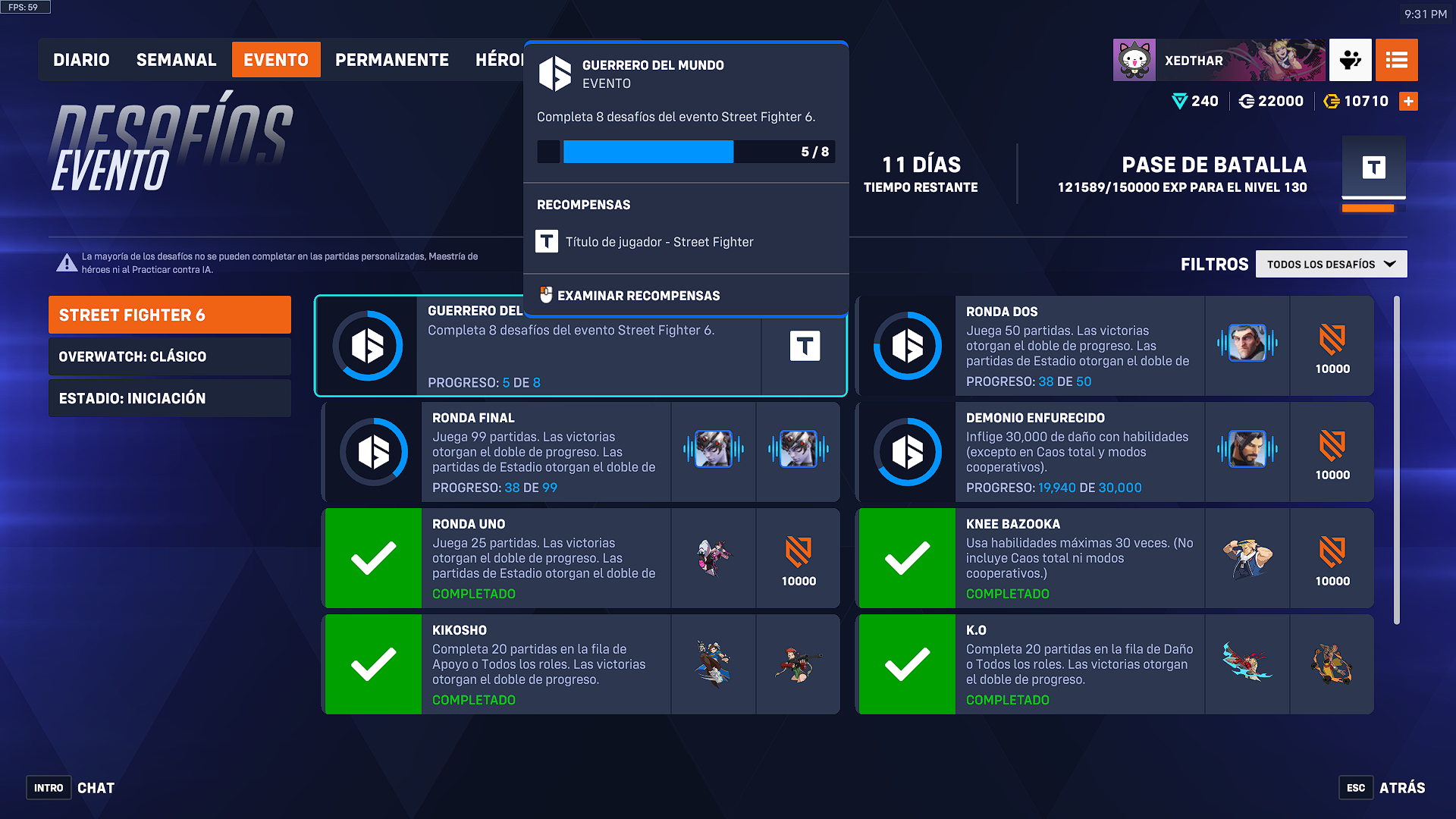 En esta ocasión los desafíos llegan con recompensas cosméticas, espráis y líneas de voz, adicionalmente experiencia para el pase de batalla. Solamente con jugar partidas se logran completar cada uno de los desafíos para conseguir el título de peleador callejero «Street Fighter». Este enfoque busca incentivar tanto la participación en el juego como la nostalgia, permitiendo a los jugadores sentir que están “peleando” por sus recompensas, como si estuvieran en una pelea de campeonato.