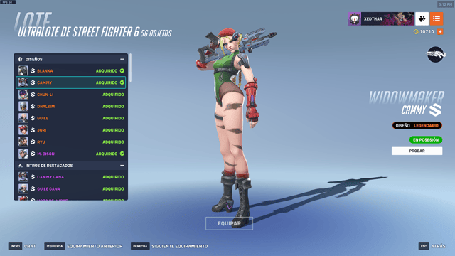 - Widowmaker como Cammy: Aspecto, intro destacada, gesto, pose de victoria, tarjeta de presentación, icono de jugador y líneas de voz.