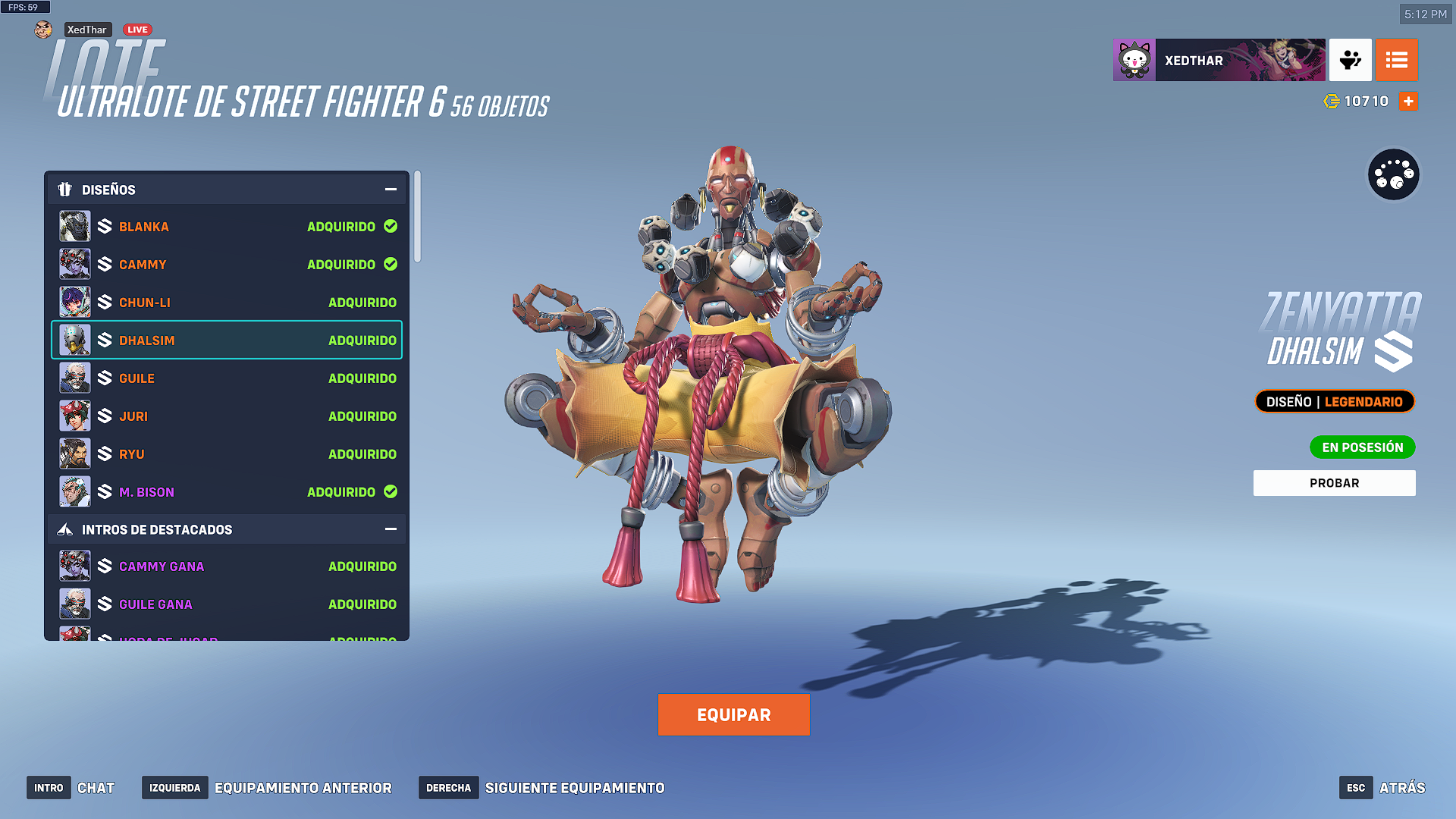 - Zenyatta como Dhalsim: Aspecto, gesto, pose de victoria, tarjeta de presentación, icono de jugador y líneas de voz.