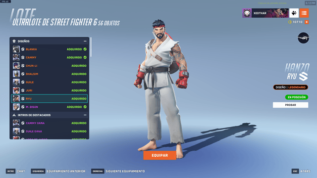 - Hanzo como Ryu: Aspecto, intro destacada, gesto, pose de victoria, tarjeta de presentación, icono de jugador y líneas de voz.