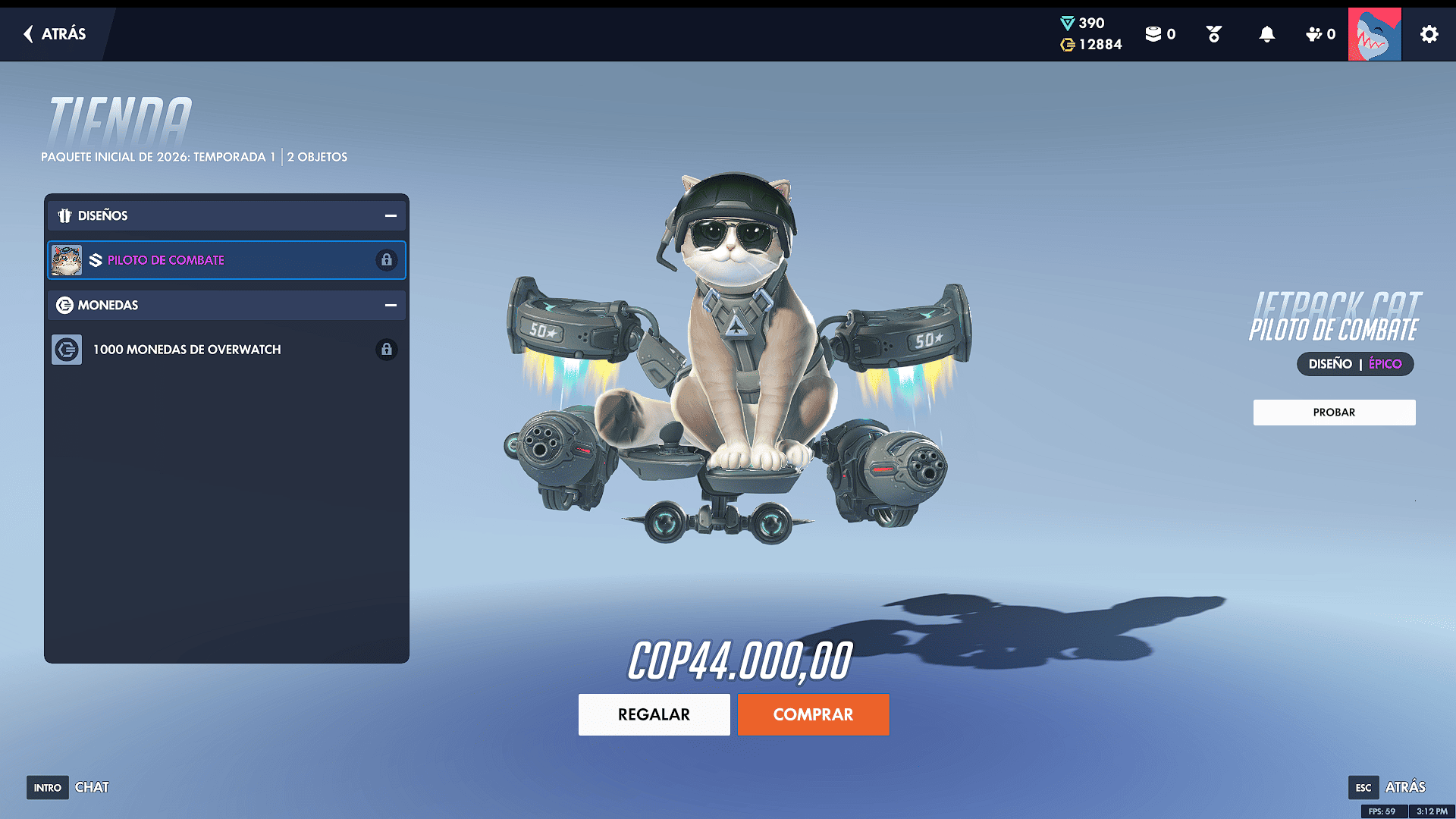 El primer paquete inicial de Overwatch temporada 1: Conquista tu corazón con un aspecto para Jetpack Cat: piloto de combate donde se resaltan sus colores en el jetpack, su pelaje cambia de color, con un gran cambio que encanta: su casquito y gafas de piloto. Junto con el aspecto se reciben 1000 monedas de overwatch, todo por un valor cercano de las 1000 monedas. Este paquete es el primer aspecto épico para Jetpack Cat. Es la mejor oferta si deseas adquirir esas monedas para comprar el pase de batalla o para ahorrar.