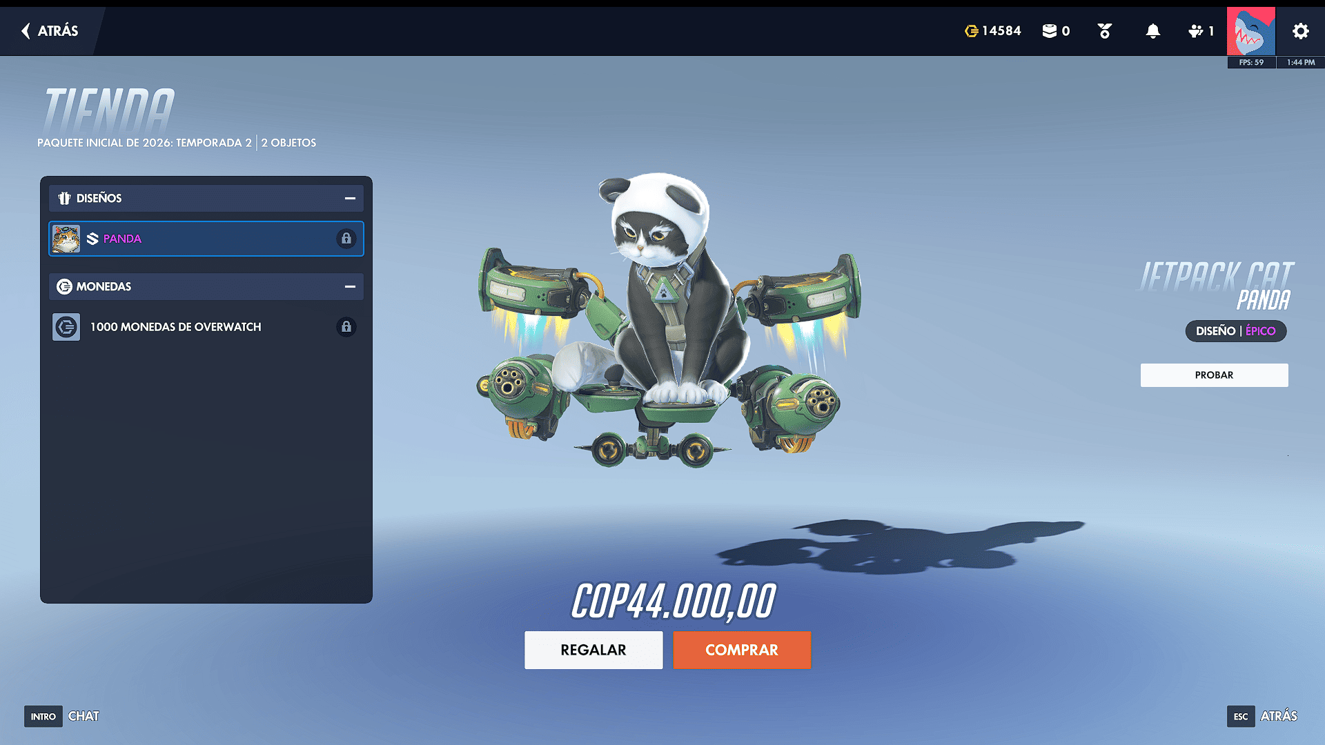 El segundo paquete inicial de Overwatch vuelve a ser un aspecto para Jetpack Cat: Panda donde la gatita Fika se disfraza de un panda para evitar ser banneada en competitivo, su pelaje cambia de color. Junto con el aspecto se reciben 1000 monedas de overwatch, todo por un valor cercano de las 1000 monedas en compra directa. Este paquete es el segundo aspecto épico para Jetpack Cat. Es la mejor oferta si deseas adquirir esas monedas para comprar el pase de batalla o para ahorrar.