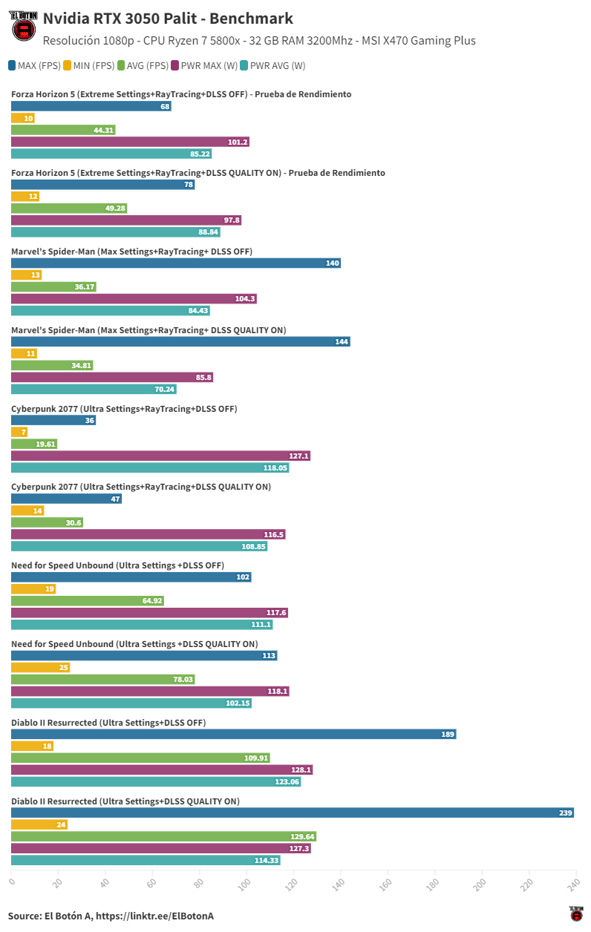 En la primera prueba se analizó Forza Horizon 5 en dos configuraciones: una sin la tecnología Ray Tracing ni DLSS y la otra con ambas tecnologías activadas. En la configuración inicial, se registró un rendimiento de 68 FPS en el pico más alto y 10 FPS en el punto más bajo, con una media de FPS de 44.31 y un consumo máximo de 101.2 W, mientras que la media de consumo fue de 85.22 W. Tras activar las tecnologías Ray Tracing y DLSS, se mejoró el rendimiento, alcanzando un FPS máximo de 78, un FPS mínimo de 12 y una media de FPS de 49.28, mientras que el consumo máximo de energía disminuyó a 97.8 W y la media de consumo se incrementó a 88.84 W.