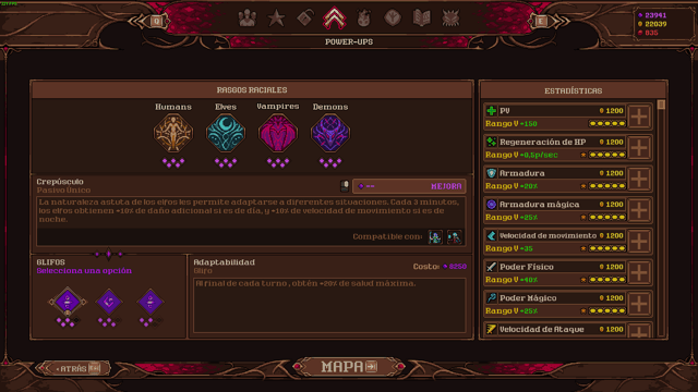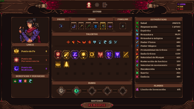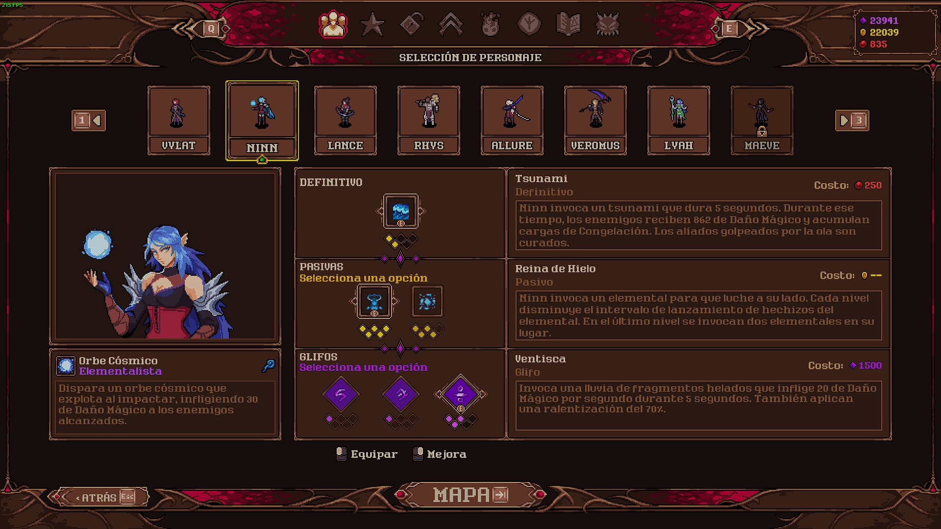 Tenemos una gran cantidad de personajes jugables y que se desbloquean conforme avancemos en el juego. Cada uno cuenta con habilidades únicas que podremos ir mejorando una vez jugando o antes de iniciar. Tendremos mejoras disponibles para cada clase, así como runas y ayudantes que mejoraran habilidades, las cuales podremos aumentar de nivel dependiendo de que tanto juguemos.