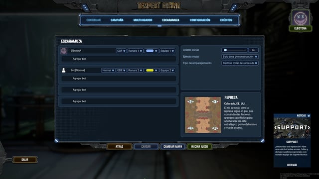 Tempest Rising ofrece cuatro niveles de dificultad: Fácil, Normal, Difícil e Insano, cada uno modificando la cantidad de fuerzas enemigas y sus niveles iniciales de veteranía. Sin embargo, y esto es importante señalarlo, incluso en el nivel más bajo la IA proporciona un desafío considerable que te mantendrá en alerta constante.