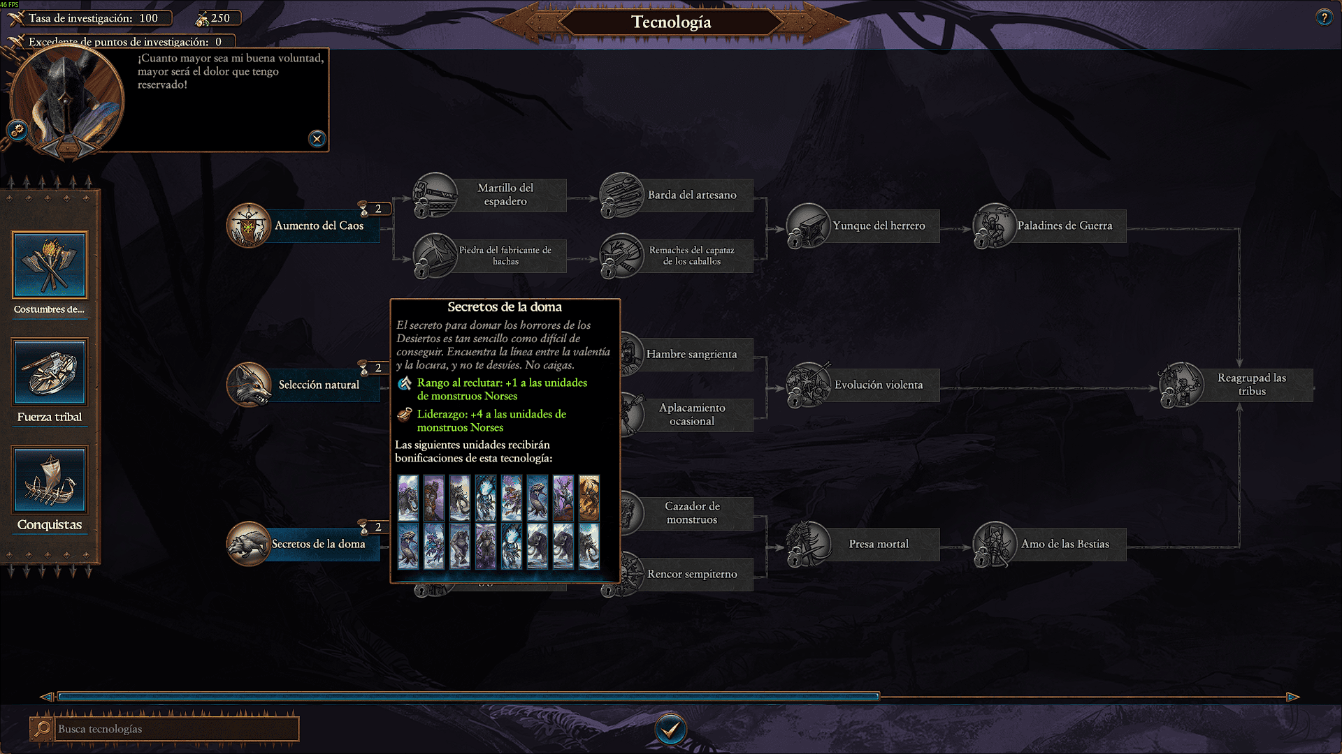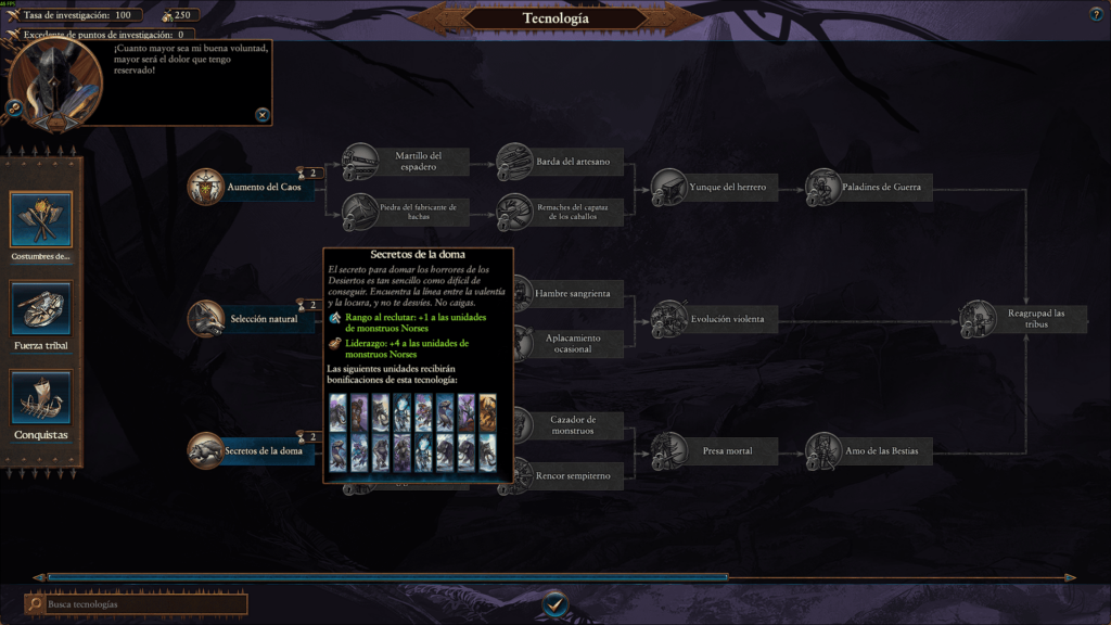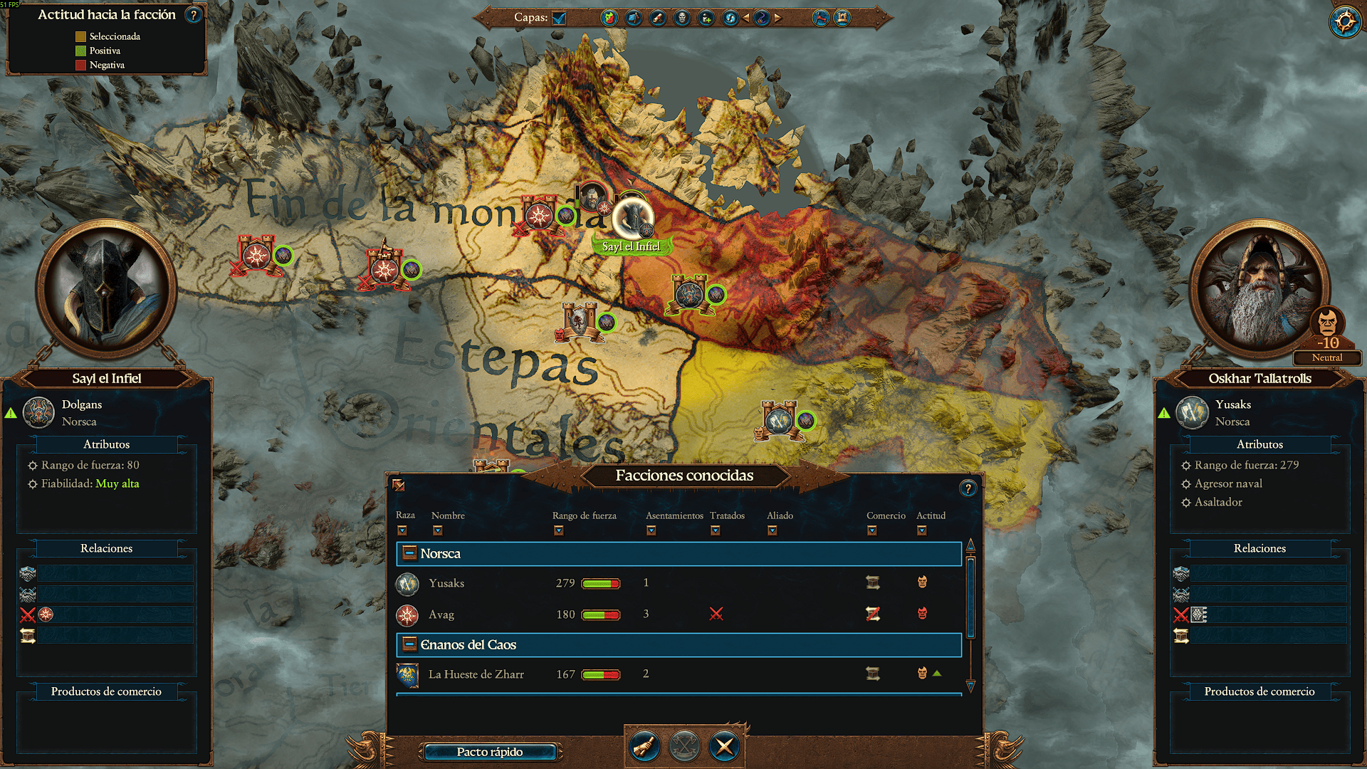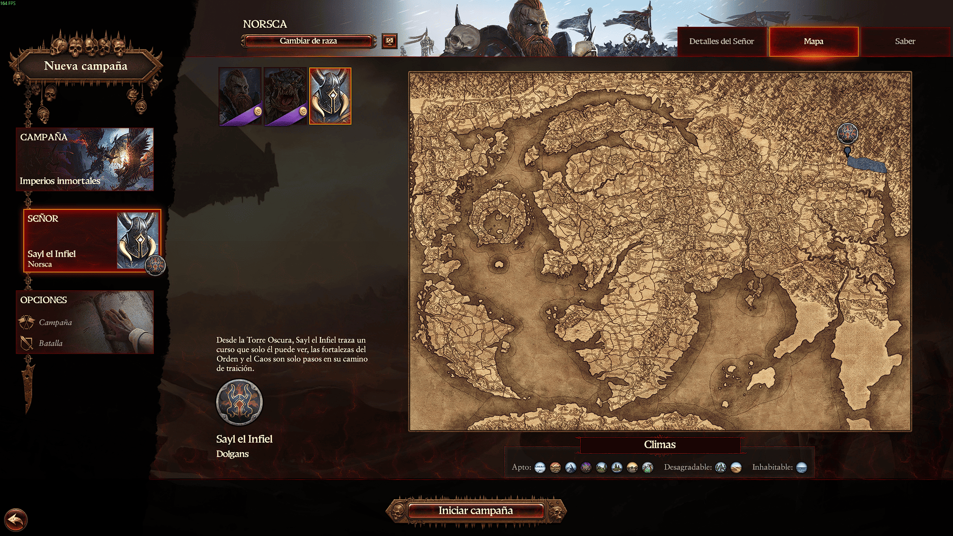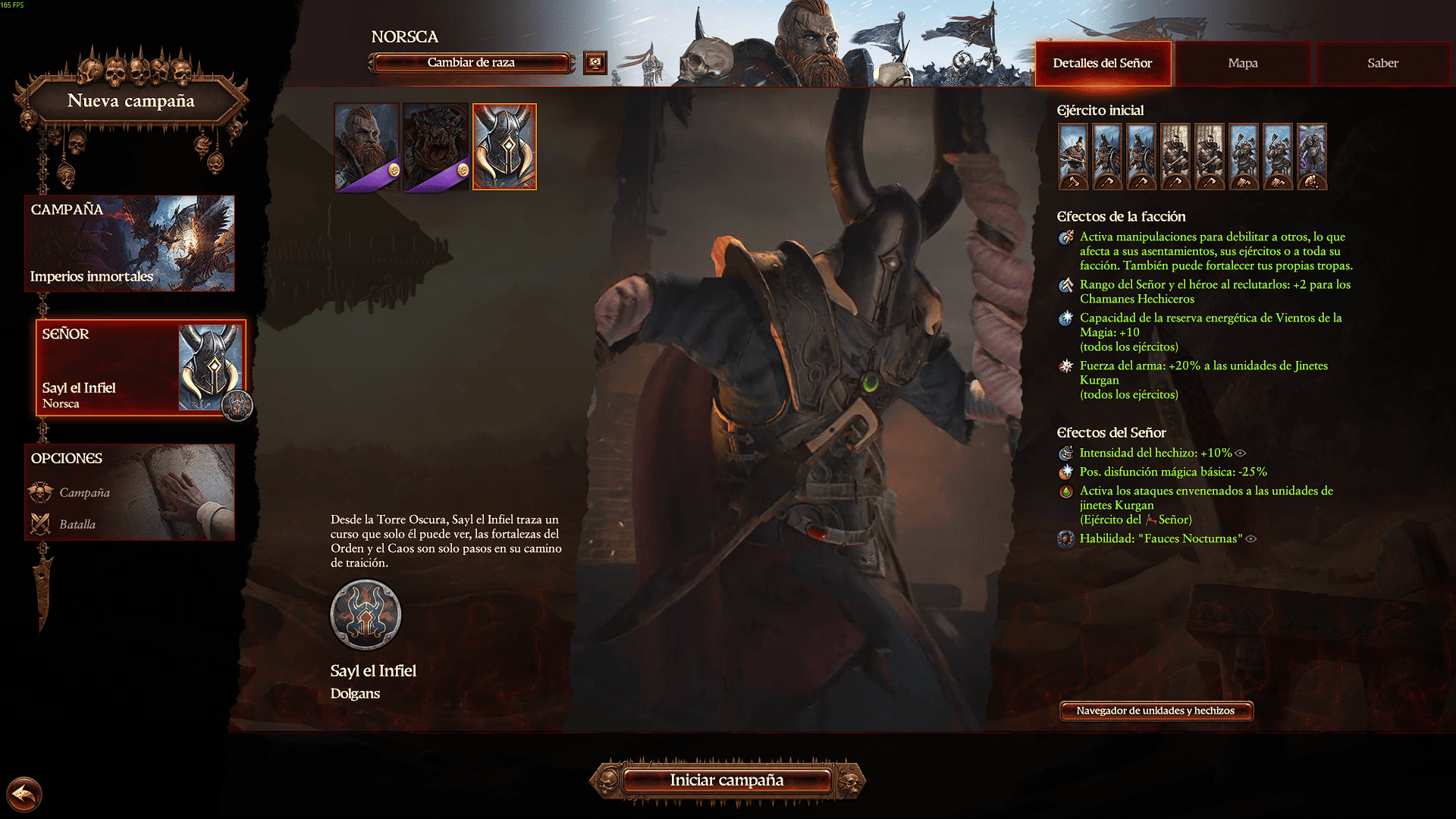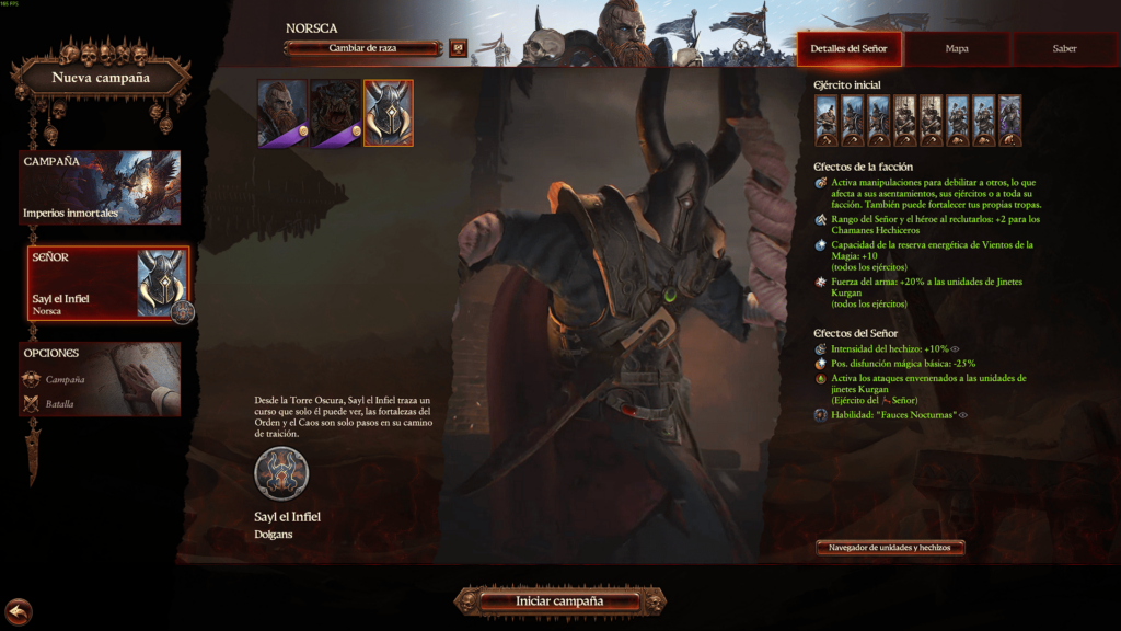Finalmente, la llegada más siniestra del DLC: Sayl el Infiel, un maestro de la traición convertido aquí en uno de los Señores Legendarios más atmosféricos de todo WARHAMMER III. El cual posee dos pilares: el primero, manipulaciones, es un sistema de juego completamente alineado con su trasfondo: sabotajes logísticos, rupturas diplomáticas, desorden civil y efectos que pueden afectar a enemigos… y a sus propios aliados. Un recurso poderoso pero peligroso, ya que el uso excesivo atrae la atención de fuerzas oscuras cuyo castigo puede caer directamente sobre Sayl. El segundo pilar, el Ritual Oscuro, dilemas y eventos de creciente tensión. Este enfoque convierte su campaña en un viaje de corrupción ascendente donde las decisiones estratégicas pueden desatar consecuencias impredecibles. Su ejército, formado por Norscanos salvajes y monstruos grotescos que tendran misiones especiales en las partidas para capturarlos, encapsula a la perfección la esencia caótica del personaje.