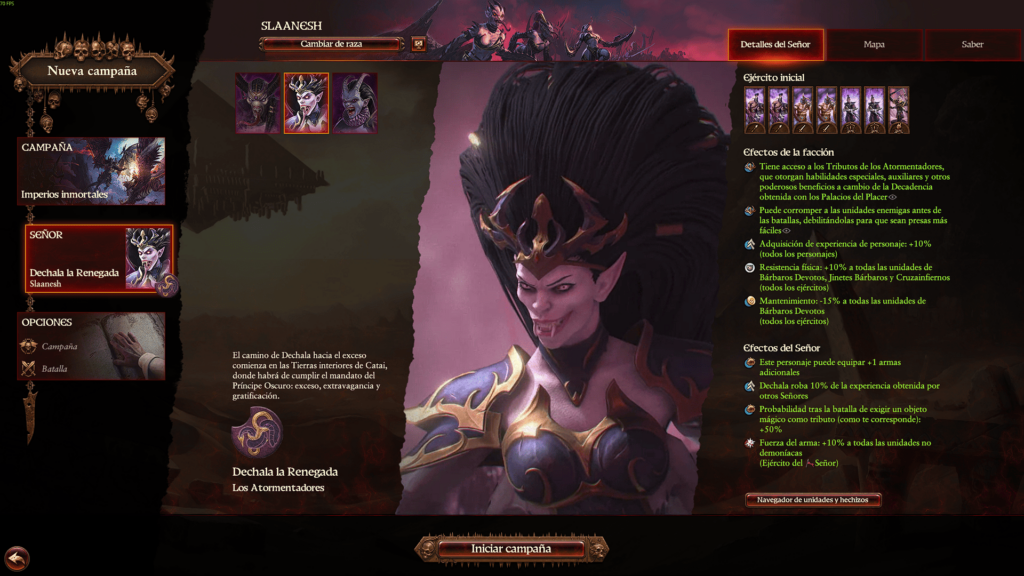 En el extremo opuesto del espectro temático se encuentra Dechala la Renegada, un avatar de Slaanesh convertido en protagonista. Su campaña se sostiene sobre la mecánica de los pilares de la crueldad, que redefine la gestión de asentamientos al permitir convertirlos en diferentes campos de tortura o placeres. Cada tipo de asentamiento impulsa una faceta diferente de su imperio: explotación masiva, supremacía militar o un eje económico-cultural que refuerza la presencia del Caos. En el campo de batalla, Dechala es una exhibición de brutal elegancia: una asesina serpentiforme con seis brazos que se abre paso entre líneas enemigas como un torbellino. Sus tropas crean un ejército rápido, cruel y devastador, perfecto para jugadores que disfrutan del control táctico de unidades ágiles y letales.