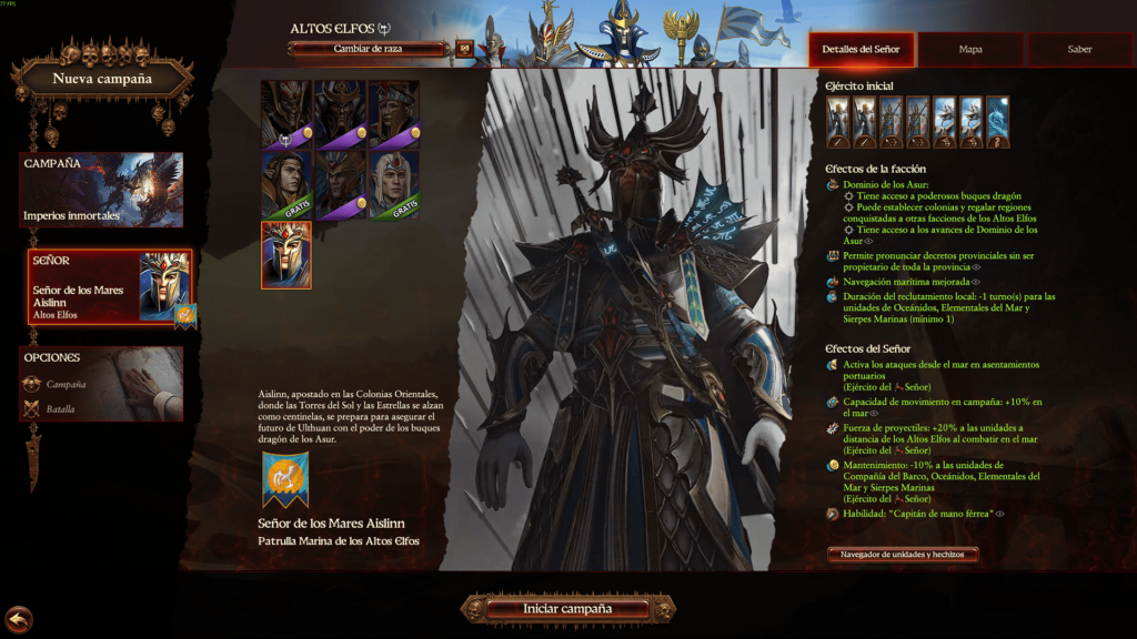 La primera gran entrada en el campo de batalla es el Señor de los Mares Aislinn, una figura frecuentemente relegada al trasfondo del universo de Warhammer, pero que aquí obtiene un foco merecido. Su campaña se construye alrededor de la flota de barcos dragón, auténticas fortalezas flotantes que funcionan como bases móviles para la expansión y comercio élfica. Esta mecánica otorga un giro único al juego en alta mar: los barcos dragón no solo permiten atacar desde cualquier punto oceánico, sino que también habilitan reclutamiento, soporte logístico y ofensivas relámpago que combinan fuerzas terrestres, aéreas y navales. En batalla, Aislinn despliega un arsenal visualmente espectacular con Skycutters, infantería élfica clásica y criaturas marítimas que aportan un estilo ofensivo agresivo y fluido, ideal para comandantes que disfrutan de campañas móviles y asedios puntuales sobre las costas enemigas.