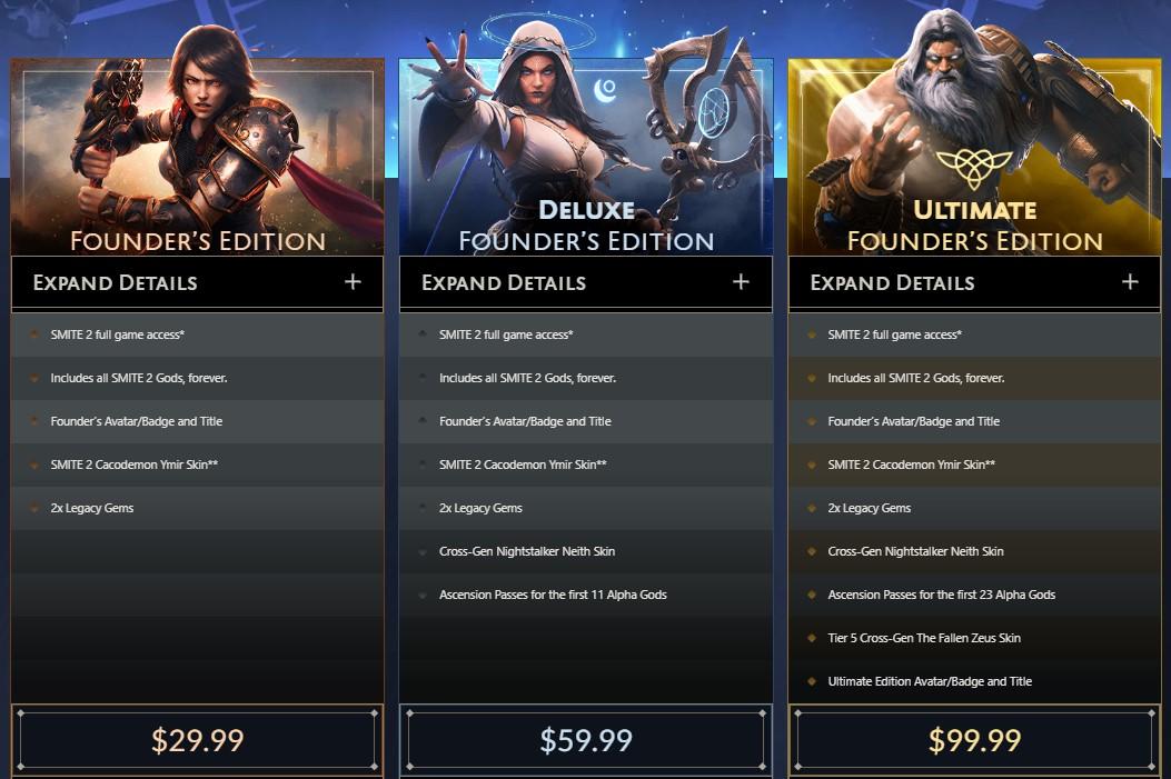 Para garantizar el acceso sin depender de la selección aleatoria, los jugadores pueden optar por comprar una de las versiones de la Edición Fundadores de Smite 2. Los detalles de cada versión y sus beneficios son los siguientes: