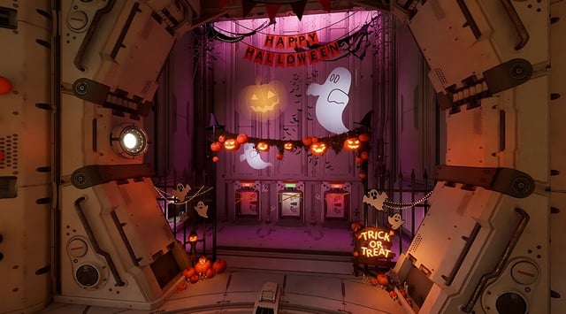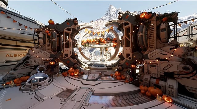 Albion se adorna con ornamentos temáticos de Halloween desde el 16 de octubre hasta el 5 de noviembre, infundiendo el hub central con calabazas, telarañas y faroles etéreos que crean un ambiente festivo inmersivo. Estas decoraciones no son meros fondos; interactúan con eventos como el Harvest Festival, potenciando la narrativa estacional y haciendo que retornos a base se sientan como visitas a un pueblo embrujado, elevando la retención en un mes clave de 2025.
